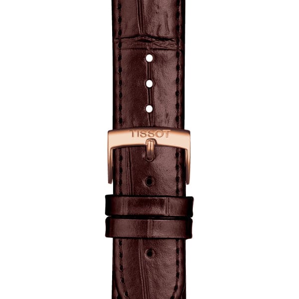 The Tissot T122.417.36.011.00 Carson watch from the T-Classic collection combines a 41mm round shaped stainless steel case with rose gold PVD coating case and brown croc-scale embossed leather strap with a traditional buckle. It has a white analogue dial which is protected beneath sapphire crystal glass. Power is generated by a 13 1/4" Swiss quartz EOL movement with a Renata 394 battery. This model also has a water resistance of up to 50 metres.