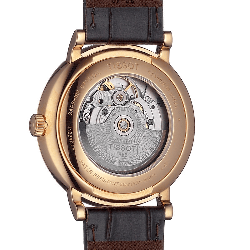 Tissot men's mechanical watch from the Carson T-Classic collection. Watch Name: Tissot Carson Premium Powermatic 80. Watch with 316 L stainless steel case with rose gold PVD treatment of round shape of size 40mm with thickness of 10.25mm and distance between the lugs of 20mm. Case with exposed case back and domed scratch-resistant sapphire glass. The dial is silver with indexes. The strap is made of brown leather and with a standard buckle. Swiss made watch with swiss automatic movement powermatic 80.111. Power Reserve: Up To 80 Hours Weight: 58 G. Waterproof watch Up To 5 bar (50 meters / 165 Feet).