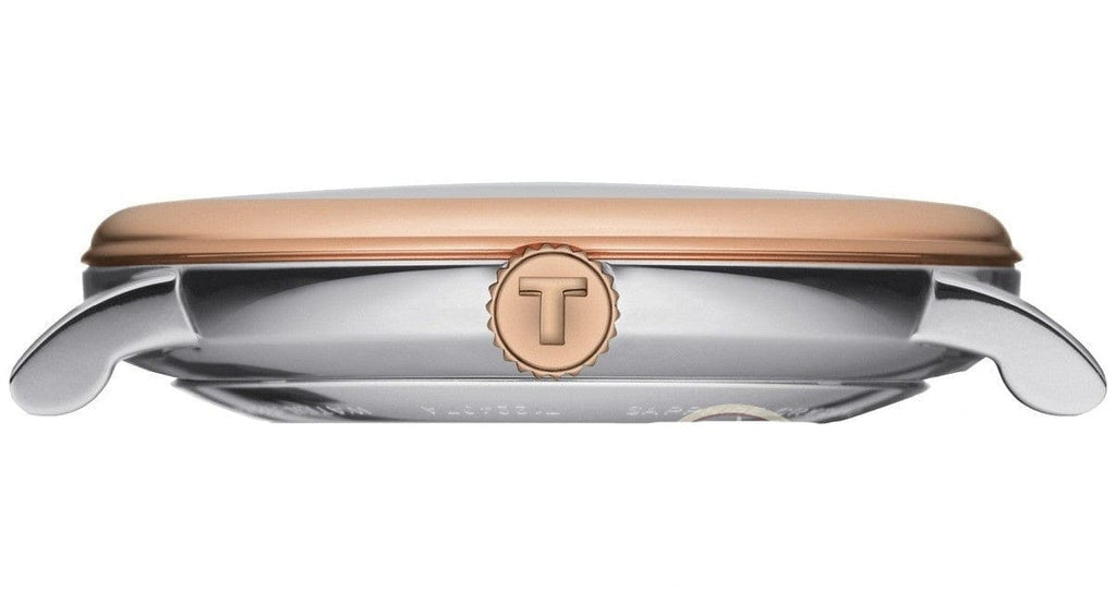 The Tissot Carson, an all-timer which will suit any time or place, will be the perfect partner to accompany you to every great occasion in your life so that every moment you live is right on time. Its classic style allows it to never go out of date, while giving it its sumptuous look, highlighted by a graceful dial design and elongated fine hands that move around the dial in time. Two tone stainless steel with rose gold PVD coating case and bracelet, silver dial. Case size 40 mm. Water resistance upto 50 meters.- Case Material: Stainless Steel