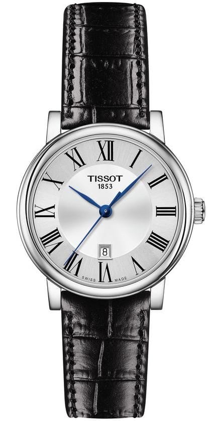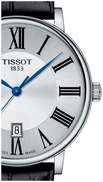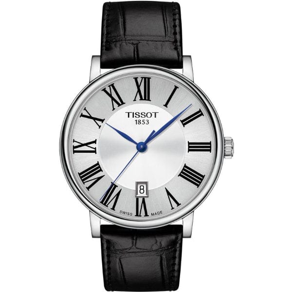 The Tissot Carson, an all-timer which will suit any time or place, will be the perfect partner to accompany you to every great occasion in your life so that every moment you live is right on time. Its classic style allows it to never go out of date, while giving it its sumptuous look, highlighted by a graceful dial design and elongated fine hands that move around the dial in time. This version features a stainless steel case with a black leather strap, silver dial with blue hands and Roman numeral hour markers, date window above the 6 o'clock position, quartz movement, and a scratch resistant sapphire crystal.Stainless steel case with a black leather strap. Fixed stainless steel bezel. Silver dial with blue hands and Roman numeral hour markers. Dial Type: Analog. Date display above the 6 o'clock position. ETA caliber F06.115 quartz movement. Scratch resistant sapphire crystal. Pull / push crown. Solid case back. Round case shape. Case size: 40 mm. Case thickness: 6.97 mm. Band width: 20 mm. Tang clasp. Water resistant at 50 meters / 165 feet. Functions: date, hour, minute, second. Casual watch style. Watch label: Swiss Made. Tissot Carson Premium Quartz Silver Dial Watch T122.410.16.033.00.