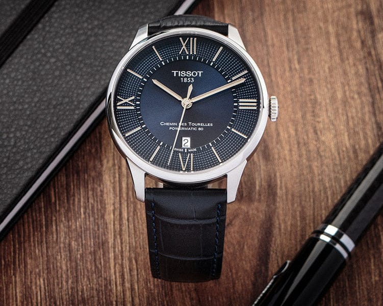 The Tissot Chemin des Tourelles is a very special piece that encapsulates an important part of Tissot's history. It bears the name of the street in Le Locle, Switzerland, where the Tissot factory was established in 1907, and where the company can still be found today. Its contemporary design is perfectly paired with the high quality of our Powermatic 80 movement, for a classic and elegant style. Discover this 42mm automatic watch with its deep blue textured dial and matching leather strap.