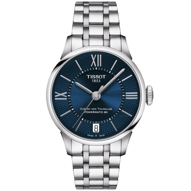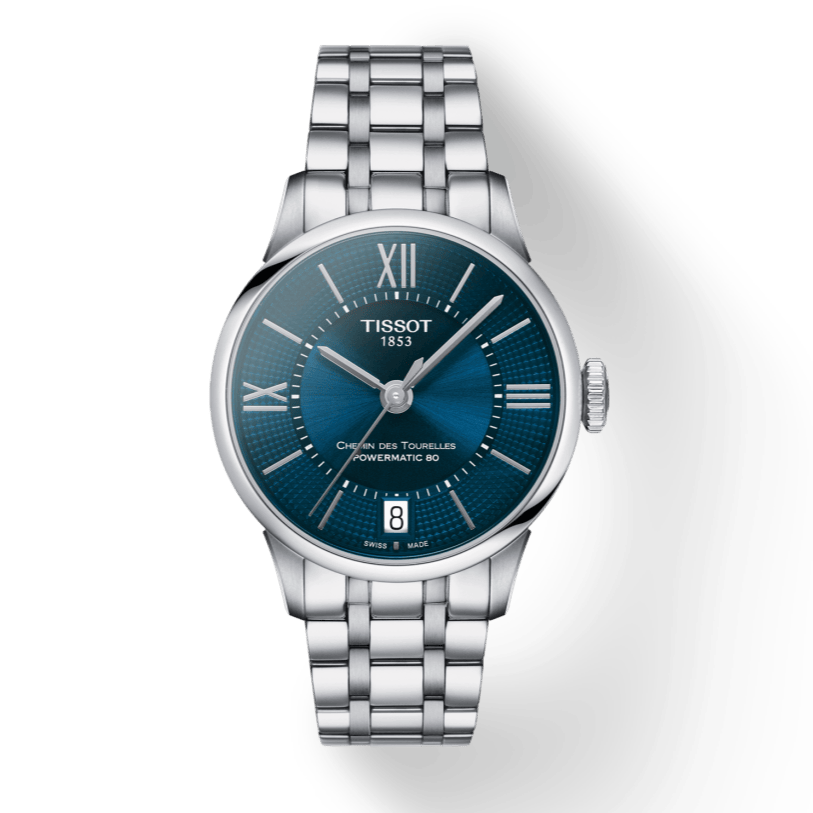 Featuring Tissot's innovative Powermatic 80 movement, the Chemin Des Tourelles watch offers precision and reliability. With a striking blue dial and elegant silver steel strap, this timepiece is the perfect blend of style and functionality for the modern woman.
