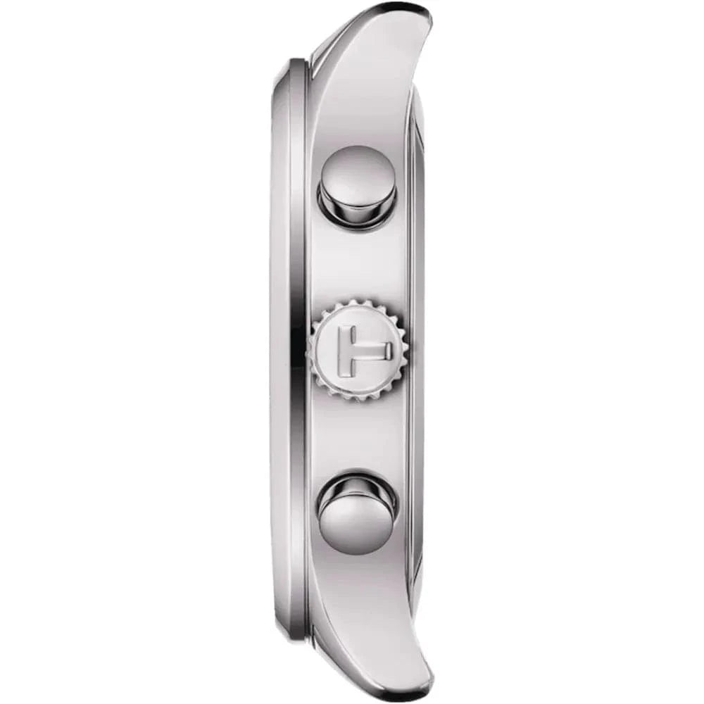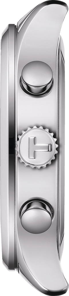 Swiss Quartz. Chronograph movement. Calendar: Date at 4 o'clock. Chronograph sub-dials display: 1/10th of a Second, 60 Second, 30 Minute, Date. Powered by Renata 394 Battery Powered engine. Watch functions: Date, Hour, Minute, Second, Chronograph, Battery End Of Life Indicator. Push-Pull crown. Scratch Resistant Sapphire crystal. Round case shape. Case size: 45mm. Case thickness: 11mm. Solid case back. 100 Meters - 330 Feet water resistant. 2 year warranty. Also known as model: T1166171109200.
