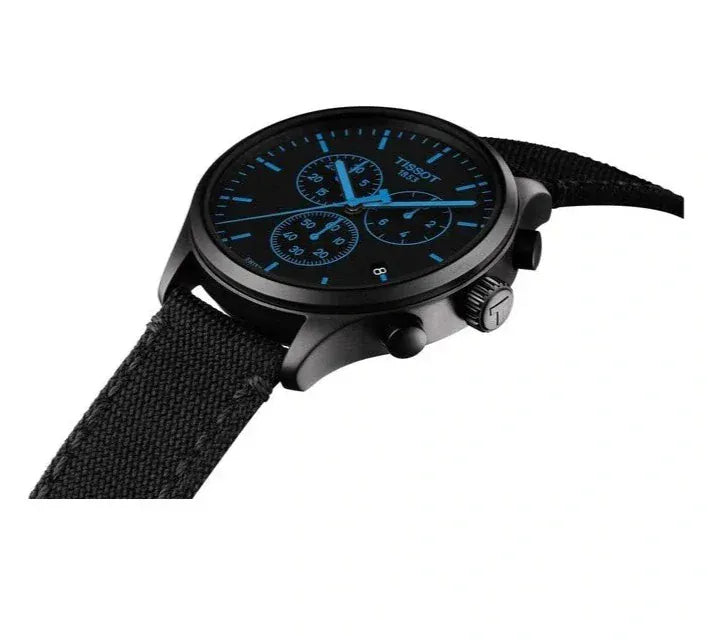 Larger than life, the Tissot Chrono XL is characterized by its big case that has a diameter of 45mm. The chronograph function adds to its urban style. Some may prefer the vintage touches of old school leather bracelets in various shades of brown with stylish stitches. It's time to think big with the Tissot Chrono XL. Stainless steel case with black PVD coating. Black fabric strap and black dial. Case size 45 mm. Water resistance upto 100 meters.