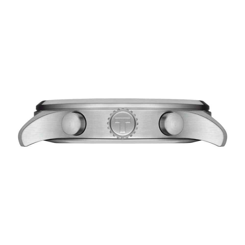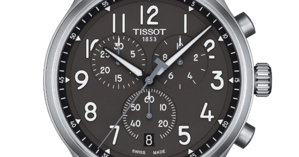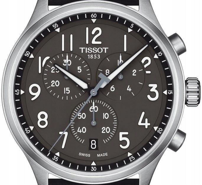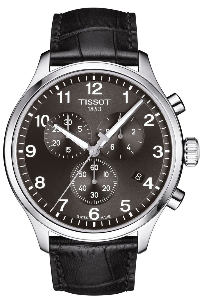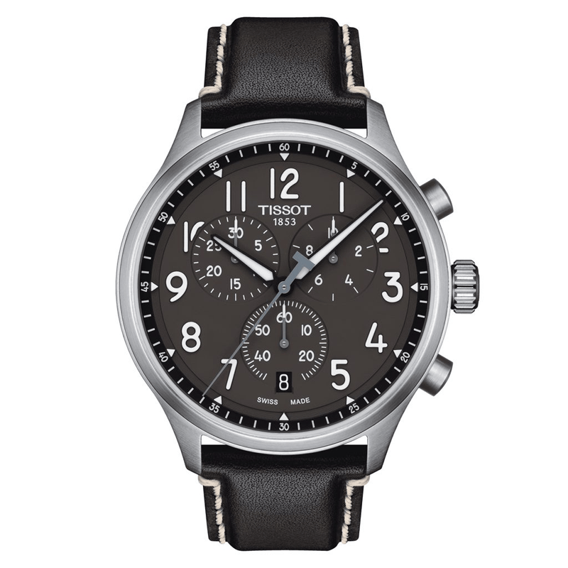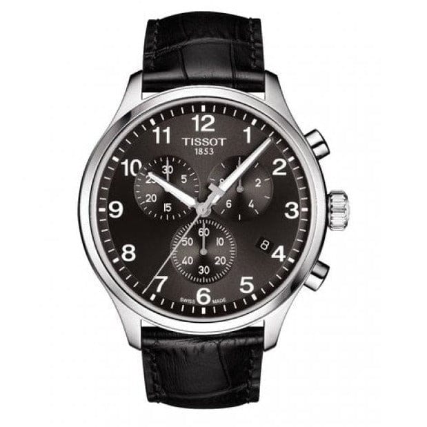 The Tissot Chrono XL Black Watch T116.617.16.062.00 combines a 45mm round-shaped stainless steel case and a black interchangeable embossed cow leather strap with a traditional buckle. It has a black analogue dial with luminescent hands, a date display, and three chronograph sub-dials protected beneath scratch-resistant sapphire crystal glass. Power is generated by the Swiss quartz movement with an end-of-life indicator. This model also has a water resistance of up to 100 metres.