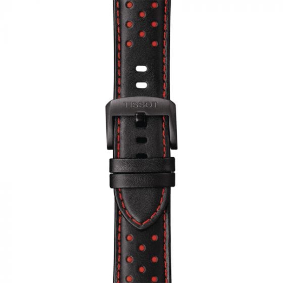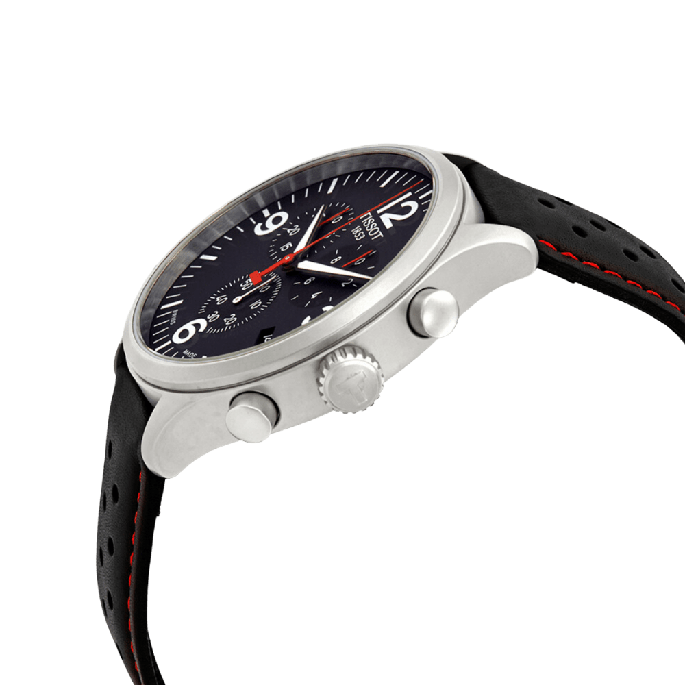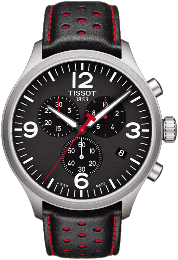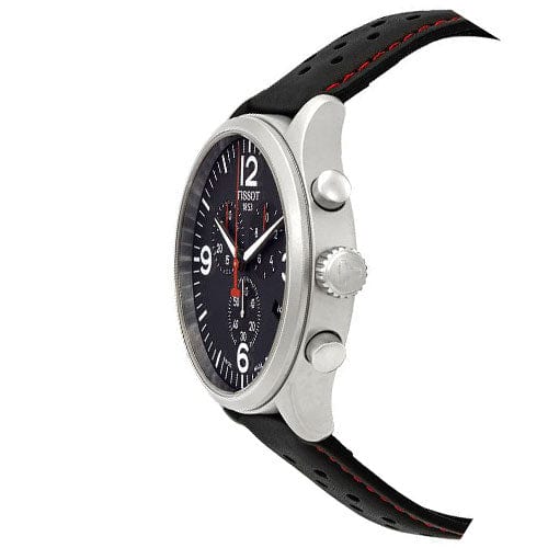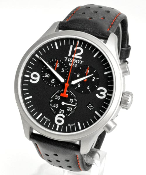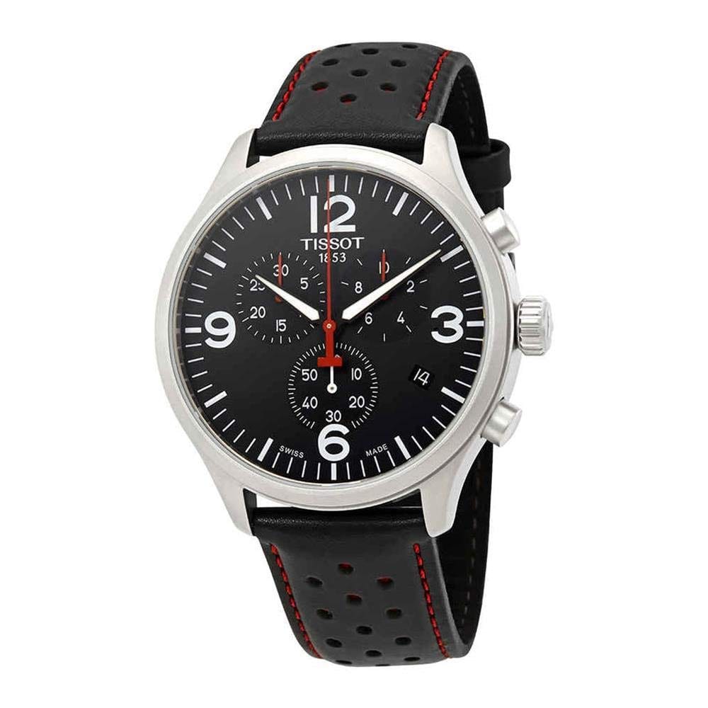 Stainless steel case with a black (calfskin) leather strap. Fixed stainless steel bezel. Black dial with luminous silver-tone hands and index hour markers. Arabic numerals amrk the 3, 6, 9 and 12 o'clock positions. Minute markers around the outer rim. Dial Type: Analog. Luminescent hands and markers. Date display at the 4 o'clock position. Chronograph - three sub-dials displaying: 60 second, 30 minute and 1/10th of a second. ETA caliber G10.212 quartz movement. Scratch resistant sapphire crystal. Solid case back. Round case shape. Case size: 45 mm. Case thickness: 11 mm. Band width: 22 mm. Tang clasp. Water resistant at 100 meters / 330 feet. Functions: chronograph, date, hour, minute, small second. Sport watch style. Watch label: Swiss Made. Tissot Chrono XL Chronograph Black Dial Men's Watch T116.617.16.057.02.