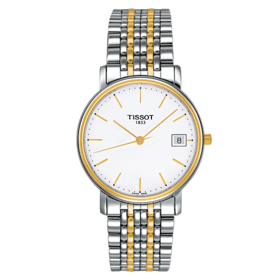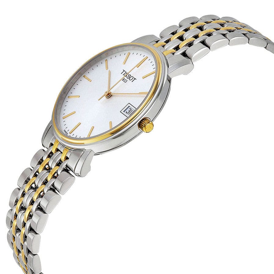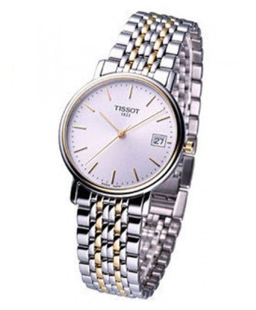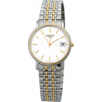 Stainless steel case with a two-tone (silver and gold-tone) stainless steel bracelet. Fixed two-tone (silver and gold-tone) bezel. Silver dial with gold-tone hands and index hour markers. Minute markers around the outer rim. Dial Type: Analog. Date display at the 3 o'clock position. Quartz movement. Scratch resistant sapphire crystal. Solid case back. Case diameter: 34 mm. Round case shape. Band width: 20 mm. Jewelry clasp. Water resistant at 30 meters / 100 feet. Functions: date, hour, minute, second. Additional Info: date displays at 3 o'clock position. Watch label: Swiss made. Tissot Desire Two-tone Steel Men's Watch T52.2.481.31.