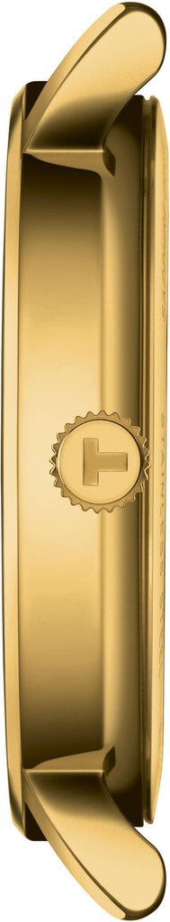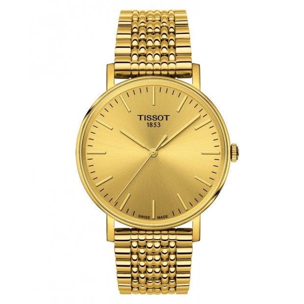 The Tissot Everytime Lady Gold Plated Watch T143.210.33.021.00 watch combines a 34mm round-shaped gold-plated stainless steel case and a gold-plated interchangeable stainless-steel mesh bracelet with a fold-over clasp to fasten. It has a gold-tone sunray analogue dial with gold-plated indexes and hands, which are protected beneath scratch-resistant sapphire crystal glass. Power is generated by the Swiss quartz movement. This model also has a water resistance of up to 50 metres.