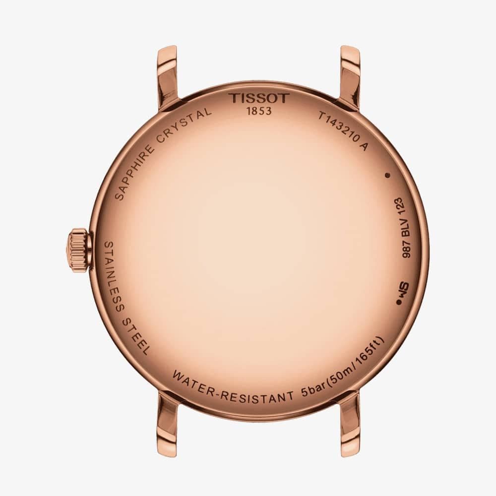 The Tissot Everytime Lady gold-plated women's watch on a gold leather strap is a fashionable, comfortable and minimalist accessory perfect for any occasion. A classic, timeless look, attractive colors and a stylish and legible dial emphasize its modern character. Tissot T143.210.36.011.00 is equipped with premium sapphire glass and made of highly durable and resistant 316L stainless steel covered with a durable rose gold PVD coating. Thanks to such high-quality materials, the wearer will be able to enjoy the beautiful condition of her elegant watch in the classic style of the Swiss Tissot brand for many years. The watch is placed in a round, polished case with a size of 34 mm case. It is powered by a reliable and precise Swiss quartz movement (battery operated).