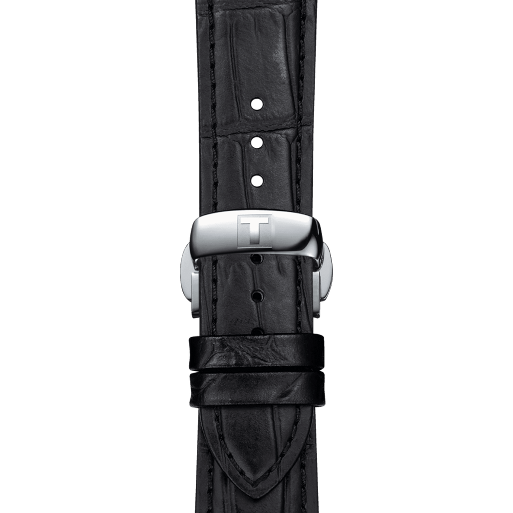 The Tissot Gentleman is the perfect everyday accessory and at the same time makes a stylish statement. The classically elegant watch comes with a case diameter of 40 mm and fits perfectly to every kind of style. The satin and polished hands and indices complete the elegant look of the Tissot Gentleman with Swiss Made quartz movement and scratch-resistant sapphire glass. This model has a 316L stainless steel case as well as a black leather strap with butterfly folding clasp with pushers and a blue dial with date display.