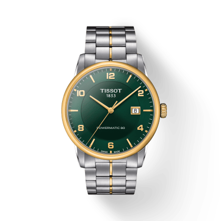 Tissot has mastered watchmaking down to a science and has given rise to an exceptional piece of ultimate precision. It is its heart that makes it truly exquisite. The secret lies with its revolutionary Powermatic 80 movement which has an extraordinary 80 hours power reserve. To match the high standards set by the movement, the timepieces exterior portrays a purely divine look with unmistakable class, adding that extra irresistible touch. There is no point in trying to resist it. You know you deserve it so just give in to this luxurious temptation.Stainless steel case with a two-tone (silver-tone and yellow gold PVD) stainless steel bracelet. Fixed yellow gold PVD bezel. Green dial with yellow gold-tone hands and alternating index and Arabic numeral hour markers. Minute markers around the outer rim. Dial Type: Analog. Date display at the 6 o’clock position. Powermatic 80.111 automatic movement.