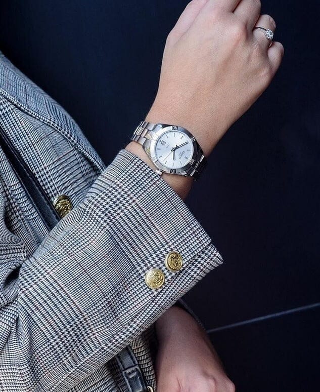 36mm stainless steel case, silver dial with diamond hour markers. Quartz movement, sapphire crystal glass and water resistant to 100m. Presented on a stainless steel bracelet.