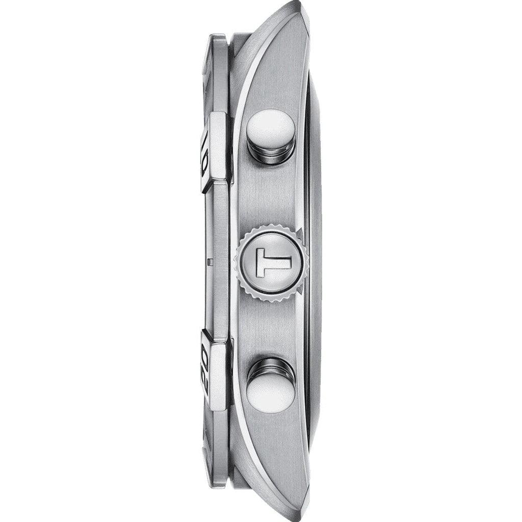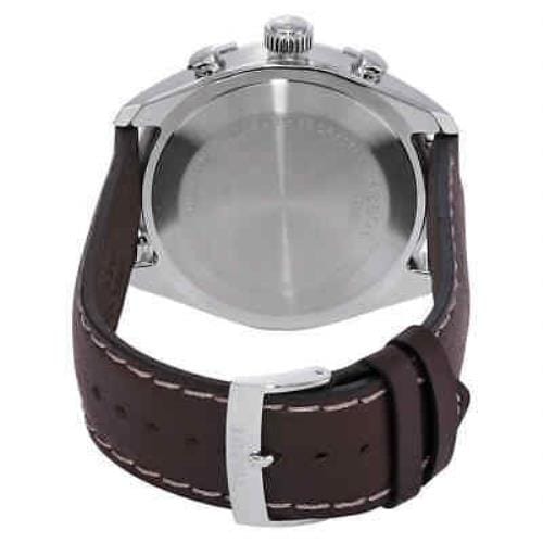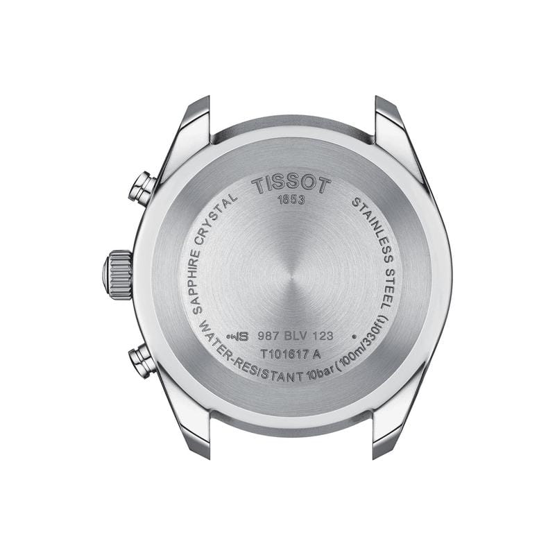 Stainless steel case with a brown (cow) leather strap. Fixed stainless steel bezel. Silver dial with luminous silver-tone hands and index hour markers. Minute markers around the outer rim. Dial Type: Analog. Luminescent hands and markers. Date display between the 4 and 5 o'clock positions. Chronograph - three sub-dials displaying: 60 second, 30 minute and 1/10th of a second. ETA caliber G10.212 quartz movement. Scratch resistant sapphire crystal. Solid case back. Round case shape. Case size: 44 mm. Case thickness: 11.1 mm. Band width: 22 mm. Tang clasp. Water resistant at 100 meters / 330 feet. Functions: chronograph, date, hour, minute, second. Sport watch style. Watch label: Swiss Made. Tissot Chronograph Quartz Silver Dial Men's Watch T101.617.16.031.00.