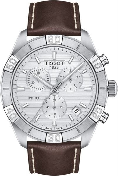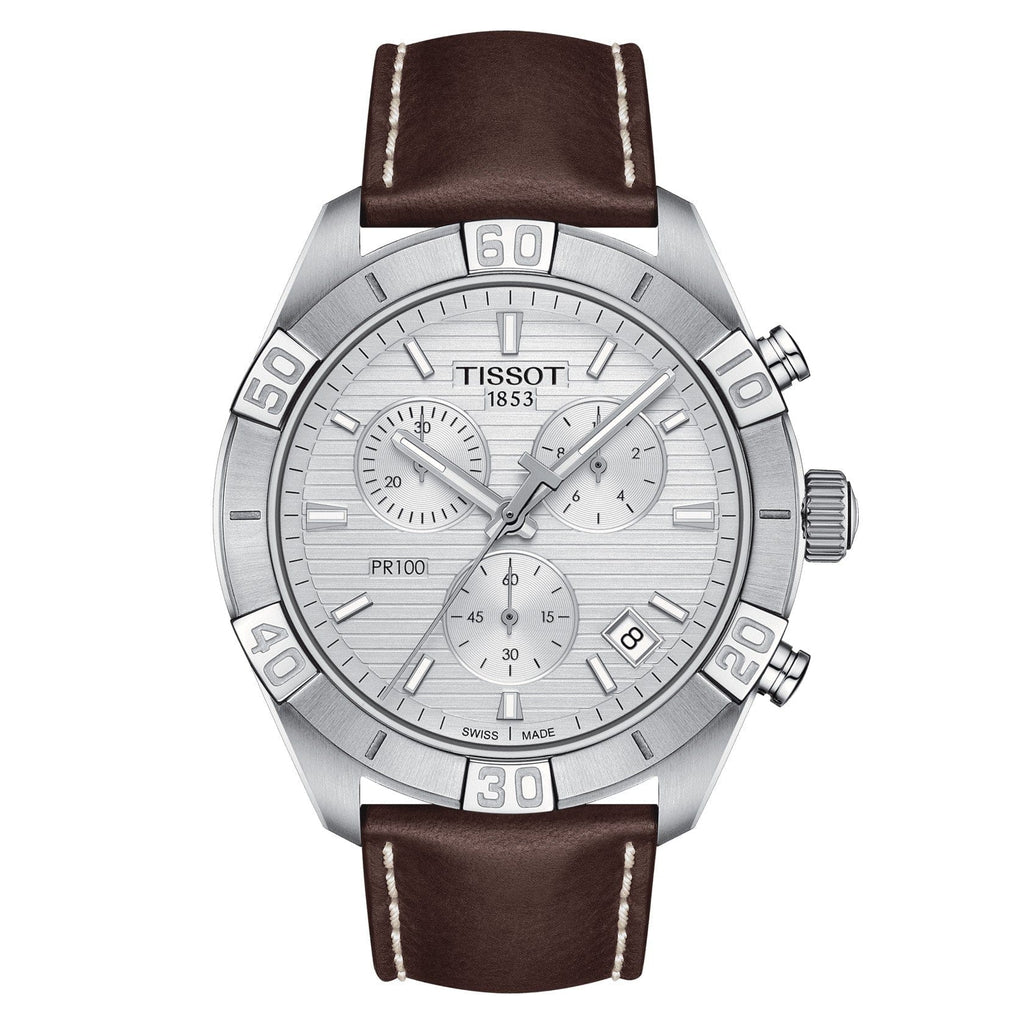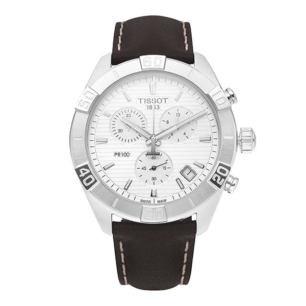 Tissot PR 100 Sport Quartz Chronograph Silver Dial Brown Leather Strap Watch For Men - T101.617.16.031.00