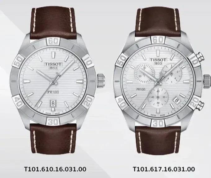 316L stainless steel case with a brown leather strap. Fixed stainless steel bezel. Silver dial with luminous silver-tone hands and index hour markers. Minute markers around the outer rim. Dial Type: Analog. Luminescent hands and markers. Date display at the 6 o'clock position. ETA caliber F06.115 quartz movement. Scratch resistant sapphire crystal. Pull / push crown. Solid case back. Round case shape. Case size: 42 mm. Case thickness: 9.4 mm. Band width: 22 mm. Fold over clasp with a safety release. Water resistant at 100 meters / 330 feet. Functions: date, hour, minute, second, battery eol indicator. Pr100 Series. Casual watch style. Watch label: Swiss Made. Tissot PR100 Quartz Silver Dial Men's Watch T101.610.16.031.00.