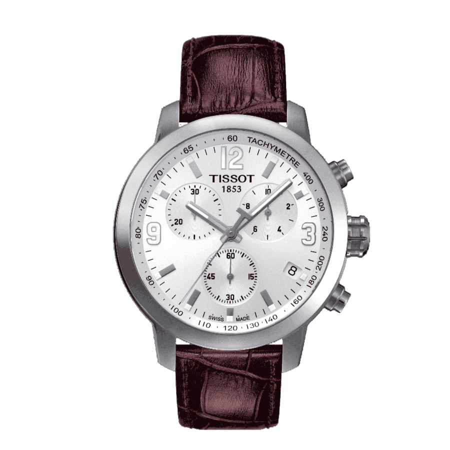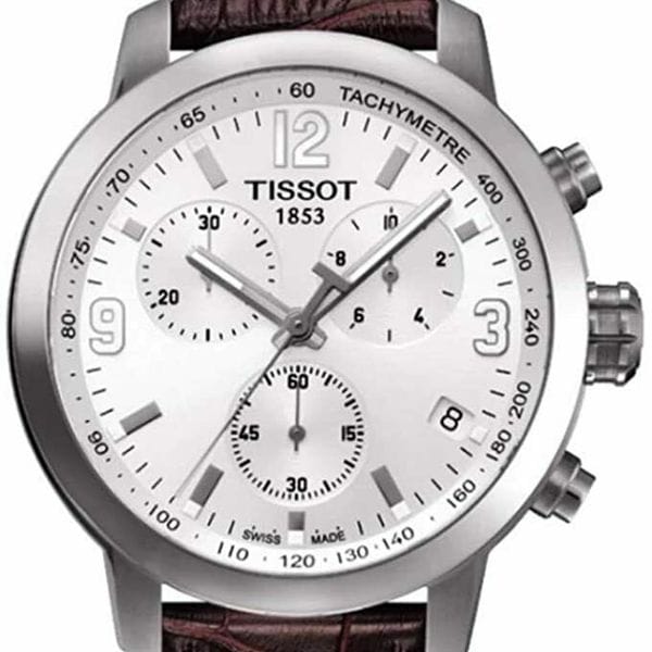 Stainless steel case with a brown leather strap. Fixed stainless steel bezel. White dial with luminous silver-tone hands and index hour markers. Arabic numerals mark the 3, 9 and 12 o'clock positions. Minute markers. Tachymeter around the outer rim. Dial Type: Analog. Luminescent hands and markers. Date display at the 4 o'clock position. Chronograph - three sub-dials displaying: 60 second, 30 minute and 1/10th of a second. Quartz movement. Scratch resistant sapphire crystal. Screw down crown. Solid case back. Case diameter: 41 mm. Case thickness: 12 mm. Round case shape. Band width: 19 mm. Butterfly clasp. Water resistant at 200 meters / 660 feet. Functions: chronograph, tachymeter, date, hour, minute, second. Casual watch style. Watch label: Swiss Made. Tissot PRC 200 Chronograph White Dial Brown Leather Men's Watch T0554171601701.Tissot PRC 200 mens watch with stainless steel case with a brown leather strap. Fixed stainless steel bezel. White dial with luminous silver-tone hands and index hour markers. Arabic numerals mark the 3, 9 and 12 o'clock positions. Minute markers. Tachymeter around the outer rim. Casual watch style. Watch label: Swiss Made.