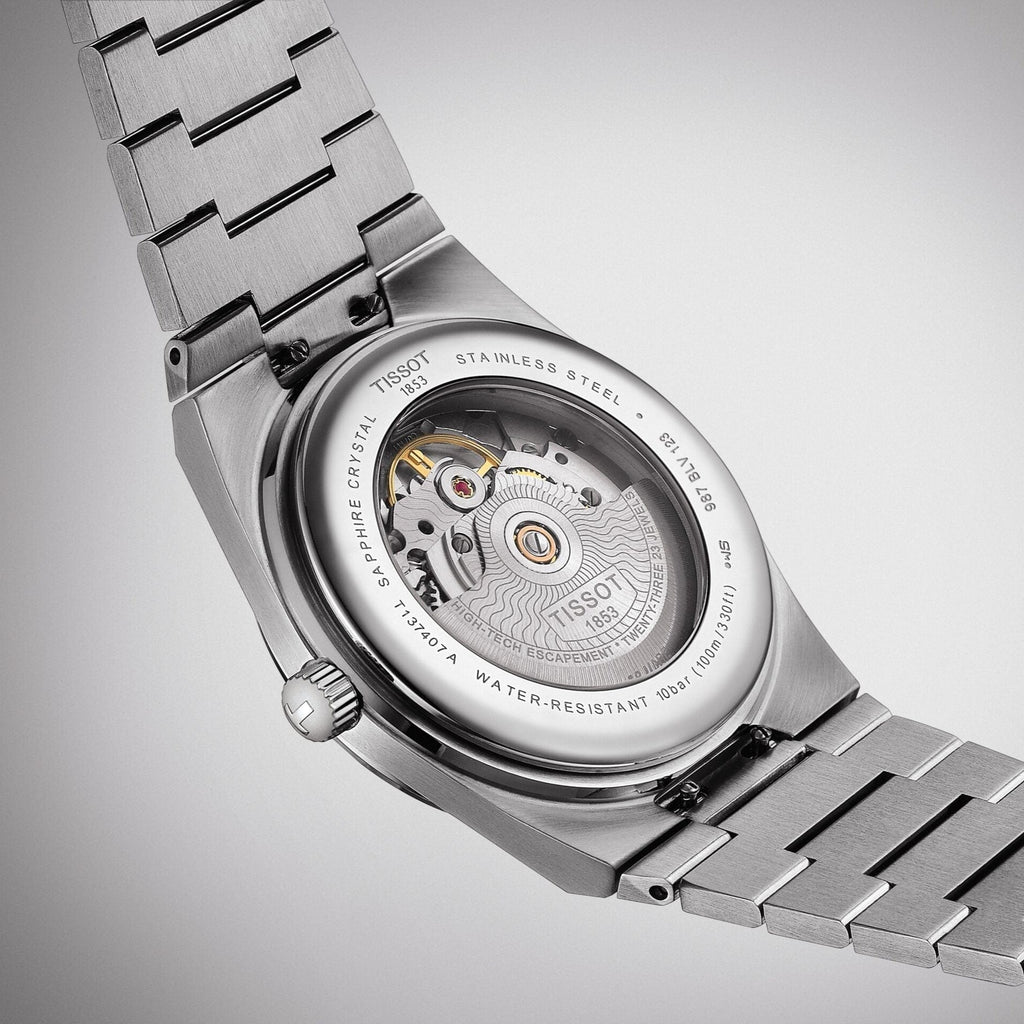 Silver-tone stainless steel case and bracelet. Fixed silver-tone stainless steel bezel. Black dial with silver-tone hands and index hour markers. Minute markers around the outer rim. Dial Type: Analog. Date display at the 3 o'clock position. Tissot Calibre Powermatic 80 automatic movement with an 80-hour power reserve. Scratch resistant sapphire crystal. Transparent case back. Round case shape, case size: 35 mm, case thickness: 10.93 mm. Water resistant at 100 meters / 330 feet. Functions: date, hour, minute, second. Prx Powermatic 80 Series. Casual watch style. Watch label: Swiss Made. Tissot PRX Powermatic 80 Automatic Black Dial Unisex Watch T137.207.11.051.00.