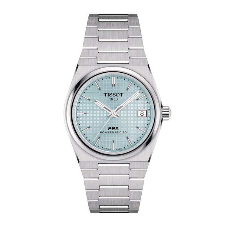 Tissot PRX 35mm Powermatic 80, where timeless aesthetics meet contemporary technology. This 35mm watch exhibits a high-quality steel case and a vibrant ice blue dial. This trendy shade casts an exquisite hue, perfectly catching and reflecting light. The distinctive waffle dial pattern adds a unique sophistication to this automatic model.