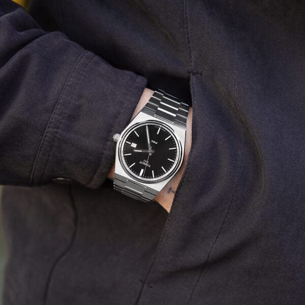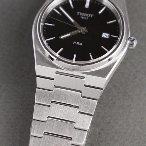 Tissot T137.410.11.051.00 PRX Men’s Watch. The case is made out of silver stainless steel with a silver bezel, which stands for the high quality of the item, it has a black dial. This model has got 100 meters of water resistance. it can be worn in scenarios where it is likely to be splashed but not immersed in water and will be fine in rain. The watch is shipped with an original box and a guarantee from the manufacturer.