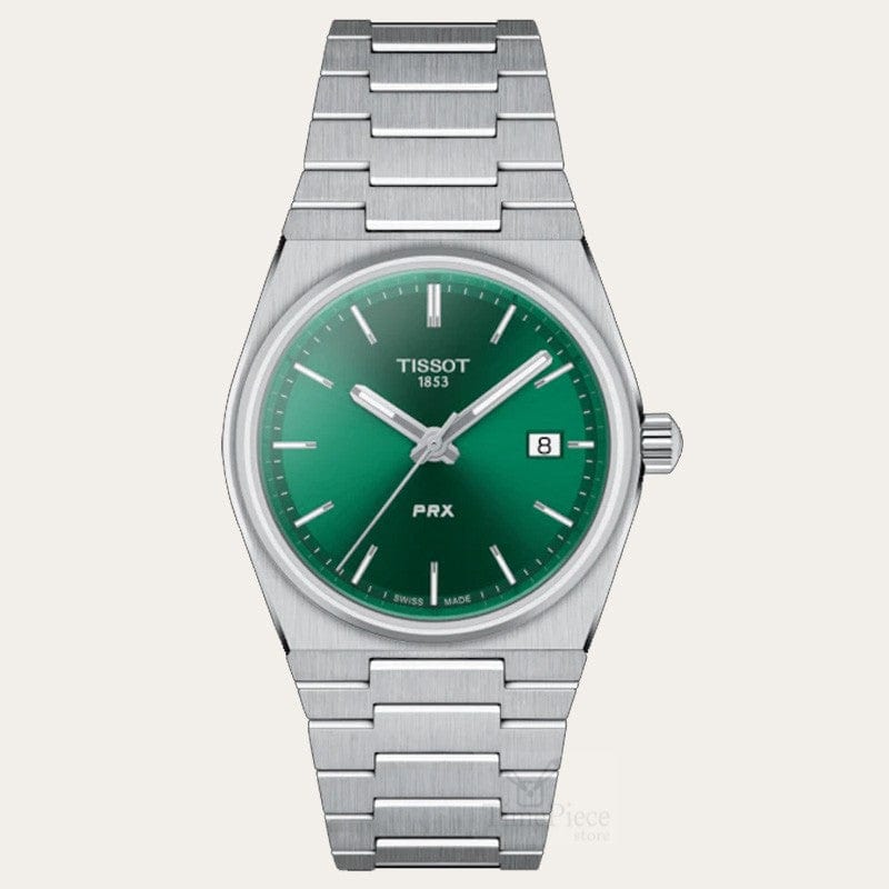 Brand New Authentic Tissot PRX Quartz Green Dial Steel Unisex Watch Model T137.210.11.081.00. Stainless Steel case with Silver Stainless Steel watch band. Deployment with Push Button clasp. Dial description: Silver tone hands and Index hour markers with minute markers around the outer rim on a Green dial. Quartz movement. Powered by Tissot Caliber ETA F05.115 engine. Watch functions: Date, Hour, Minute, Second, Battery End Of Life Indicator. Scratch Resistant Sapphire crystal. Tonneau case shape. Case size: 35mm. Case thickness: 9.6mm. Solid case back. 100 Meters - 330 Feet water resistant. 2 year warranty. Also known as model: T1372101108100.
