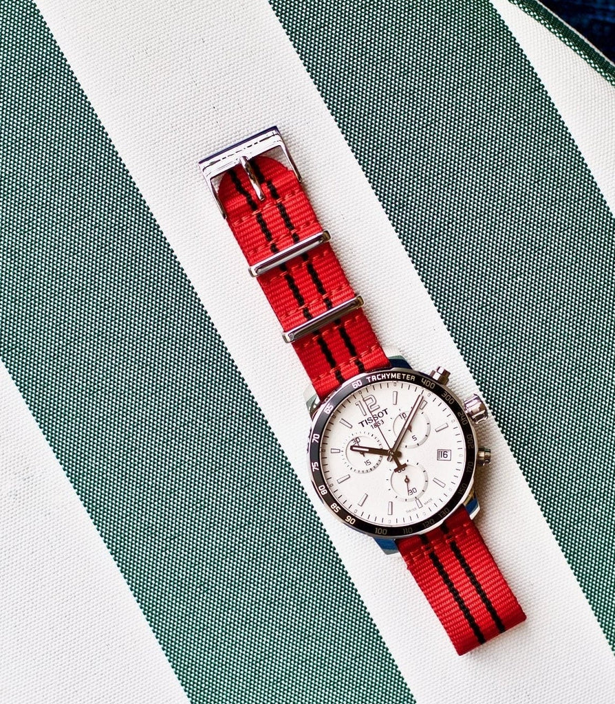 Fans will be able to wear the Tissot Quickster NBA watches with pride as they support their favorite team. The pieces have a fitting sporty look with a contemporary teamed colored Nato strap to match. Each case features a respective team logo, silk printed on the back.
