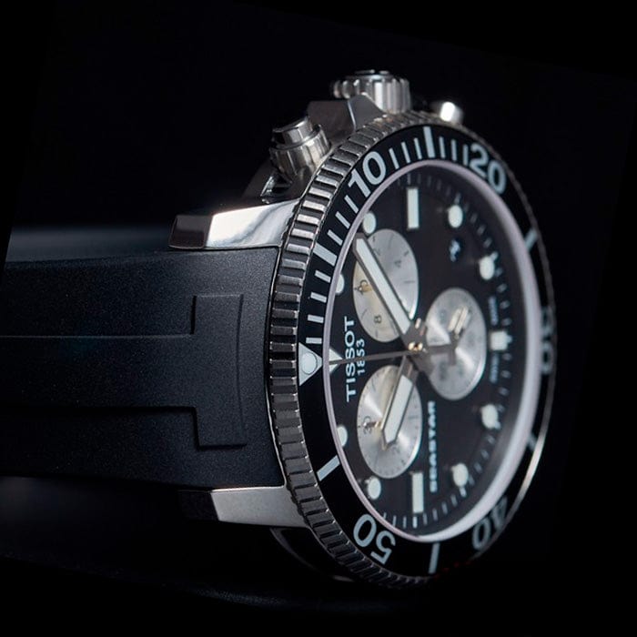 The Tissot Seastar 1000 merges style and performance without compromising either. The diving inspiration shapes both the appearance and the functionality of this watch. It maintains its performance to a pressure of 30 bar (300m/1'000ft), combining underwater sports and a preference for a sophisticated Swiss timepiece. The diving theme continues through elements such as a unidirectional bezel, a strap with a divers' safety buckle, plus luminescent hands and markings.