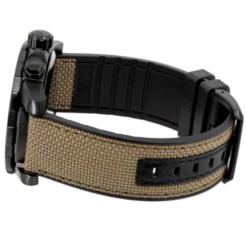 Black PVD stainless steel case with a black leather strap with a (stiched) beige textile top. Fixed black PVD bezel with a black aluminium ring showing tachymeter markings. Black dial with luminous yellow gold hands and index hour markers. Minute markers around the outer rim. Dial Type: Analog. Luminescent hands and markers. Date display at the 6 o'clock position. Chronograph - three sub-dials displaying: 60 second, 30 minute and 1/10th of a second. ETA Caliber G10.212 quartz movement.