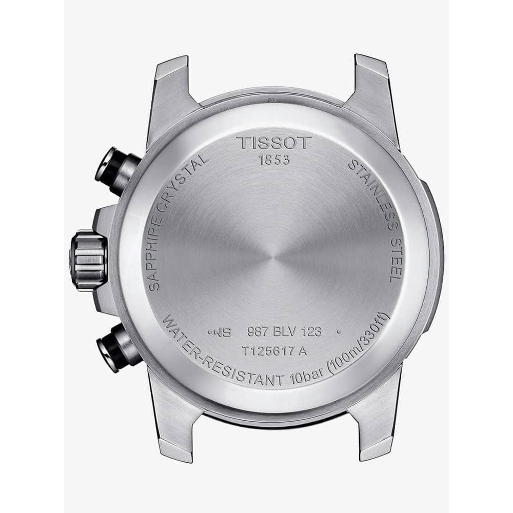 The Tissot T125.617.17.051.02 watch combines a 46mm round shaped stainless-steel case and black leather strap with textile detailing and a traditional buckle. It has a black analogue dial with two black luminescent hands with a yellow second tracker. Date is visible at position 6 with black chronograph sub dials and a tachymeter scale on the bezel, which is protected beneath sapphire crystal glass. Power is generated by the quartz movement. This model also has a water resistance of up to 100 metres.