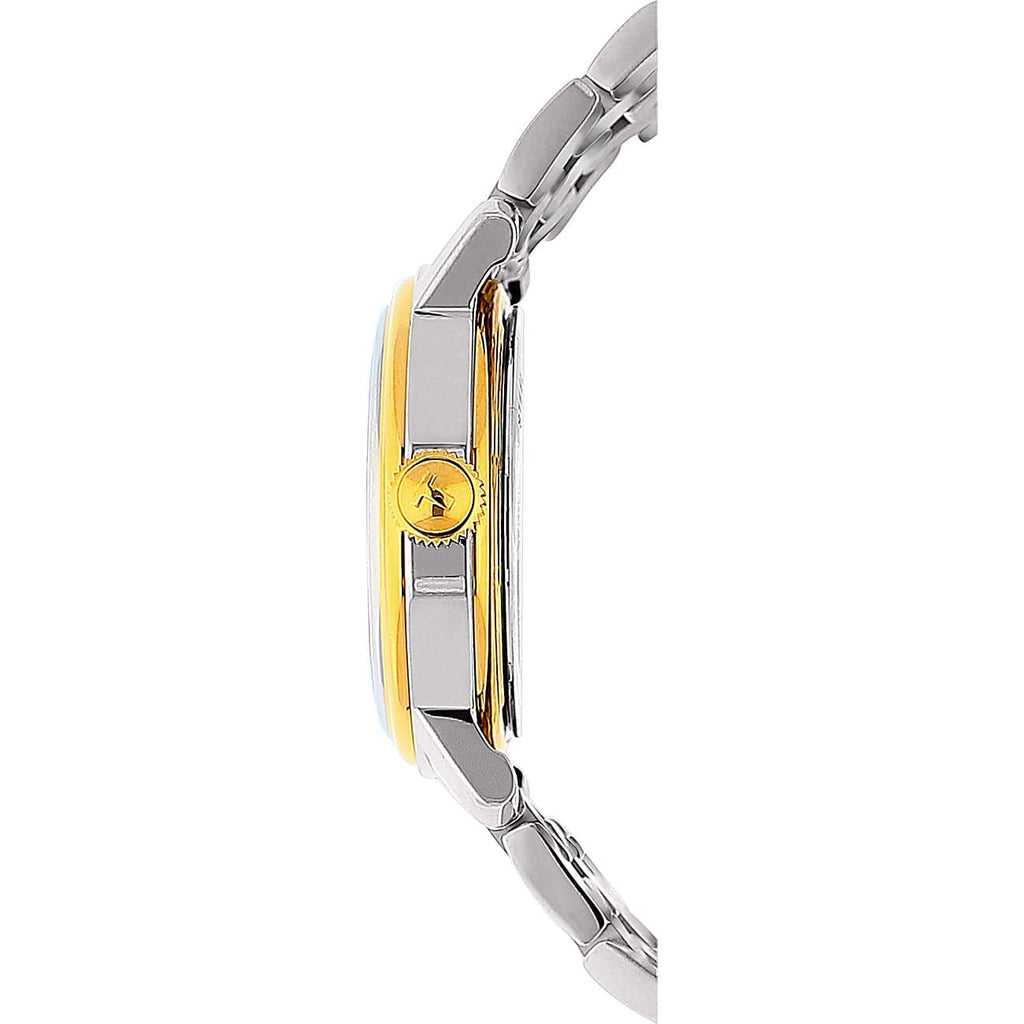 Stainless steel case with a two-tone (silver-tone and gold PVD ) stainless steel bracelet. Fixed two-tone (silver-tone and gold PVD ) bezel. White mother of pearl dial with gold-tone hands and diamond hour markers. Roman numerals mark the 6 and 12 o'clock positions. Minute markers around an inner ring. Dial Type: Analog. Date display at the 3 o'clock position. ETA caliber F03.111 quartz movement. Scratch resistant sapphire crystal. Solid case back. Case size: 29 mm. Case thickness: 8.2 mm. Round case shape. Band width: 14 mm. Fold over clasp. Water resistant at 50 meters / 165 feet. Functions: date, hour, minute, second. Dress watch style. Watch label: Swiss Made. Item Variations: T097 010 22 116 00, T097-010-22-116-00, T097/010/22/116/00, T0970102211600. Tissot Bridgeport Mother of Pearl Dial Ladies Watch T097.010.22.116.00.