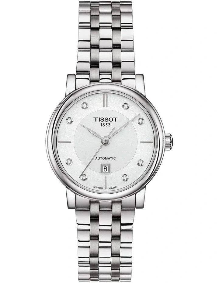 The Tissot Carson, an all-timer which will suit any time or place, will be the perfect partner to accompany you to every great occasion in your life so that every moment you live is right on time. Its classic style allows it to never go out of date, while giving it its sumptuous look, highlighted by a graceful dial design and elongated fine hands that move around the dial in time. 30mm stainless steel case. Stainless steel bracelet. See-through case back. Domed scratch resistant sapphire crystal with antireflective coating. Silver dial with indexes and 8 diamonds markers. Swiss automatic movement with power reserve of upto 38 hours. Water resistant upto 50 meters.