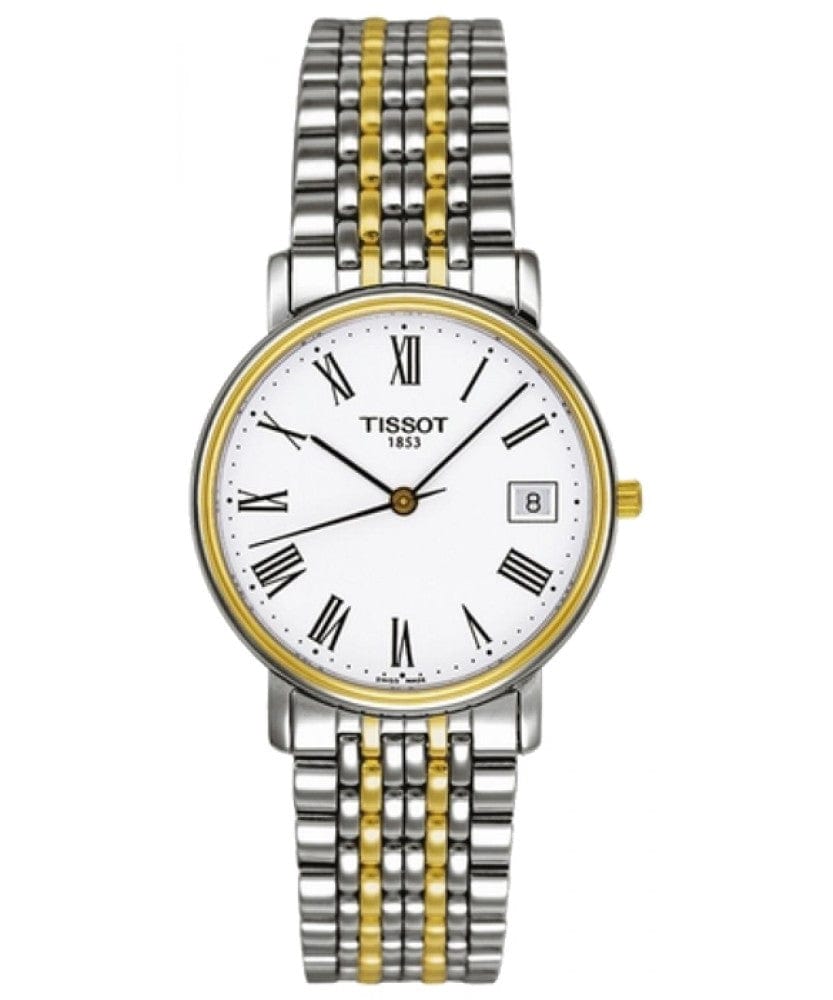 Stainless steel case with a two-tone (silver and gold-tone) stainless steel bracelet. Fixed gold-tone bezel. Silver dial with black hands and Roman numeral hour markers. Minute markers around the outer rim. Dial Type: Analog. Date display at the 3 o'clock position. Quartz movement. Scratch resistant sapphire crystal. Solid case back. Case diameter: 34 mm. Deployment clasp. Water resistant at 30 meters / 100 feet. Functions: date, hour, minute, second. Dress watch style. Watch label: Swiss made. Tissot T-Classic Desire Mens Watch T52.2.481.13.