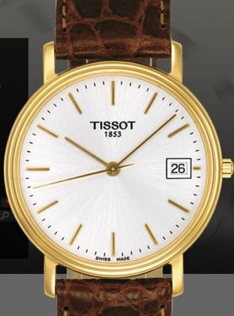 Gold PVD stainless steel case with a brown leather strap. Fixed gold PVD bezel. Silver dial with gold-tone hands and index hour markers. Minute markers around the outer rim. Dial Type: Analog. Date display at the 3 o'clock position. Quartz movement. Scratch resistant sapphire crystal. Pull / push crown. Solid case back. Case diameter: 34 mm. Case thickness: 5.85 mm. Round case shape. Tang clasp. Water resistant at 30 meters / 100 feet. Functions: date, hour, minute, second. Casual watch style. Watch label: Swiss Made. Item Variations: T52541131. Tissot Classic Desire Silver Dial Brown Leather Men's Watch T52.5.411.31.