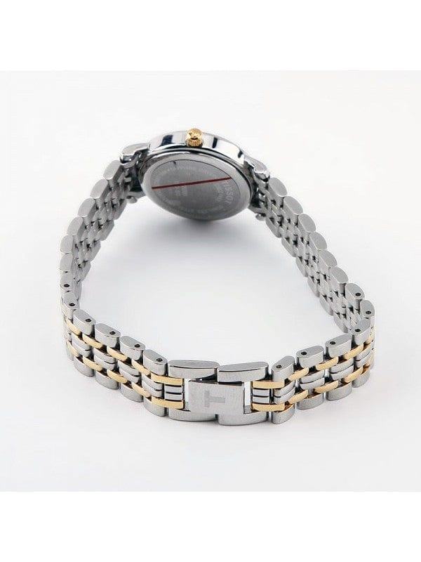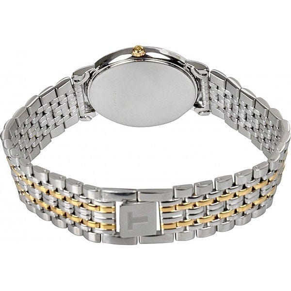 Stainless steel case with a two-tone (silver and gold-tone) stainless steel bracelet. Fixed gold-tone bezel. Silver dial with gold-tone hands and stick hour markers. Minute markers around the outer rim. Dial Type: Analog. Date display at the 3 o'clock position. Quartz movement. Scratch resistant sapphire crystal. Solid case back. Case diameter: 25 mm. Deployment clasp. Water resistant at 30 meters / 100 feet. Functions: hours, minutes, seconds, date. Casual watch style. Tissot T-Classic Desire Two-tone Ladies Watch T52228131.