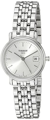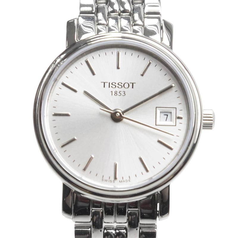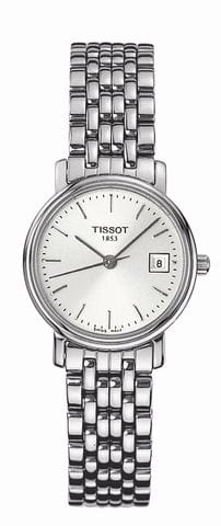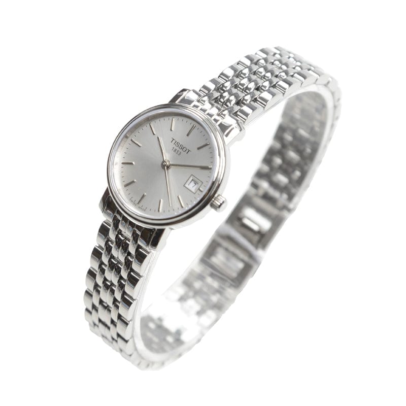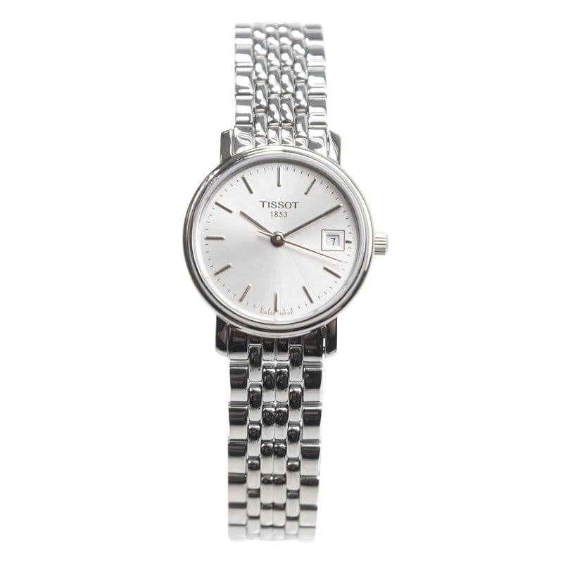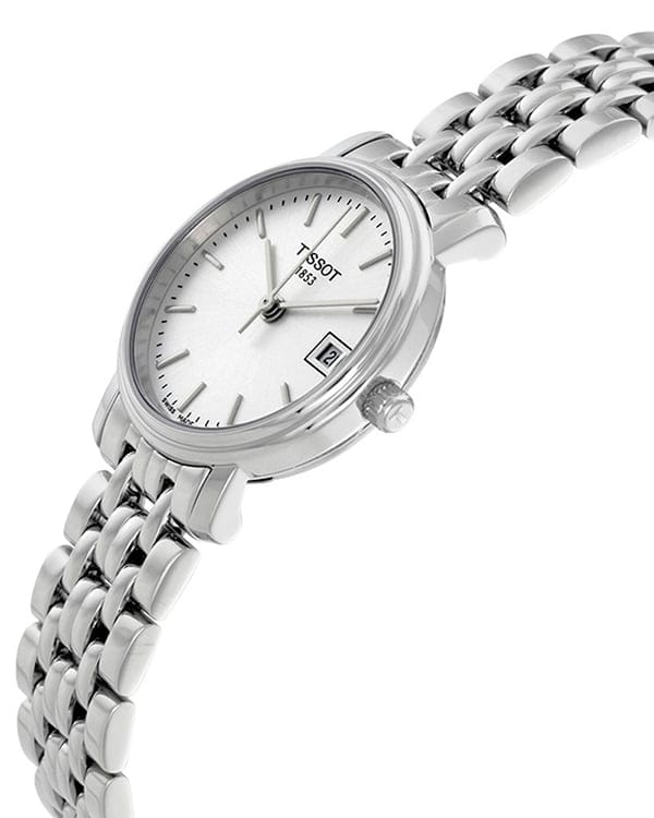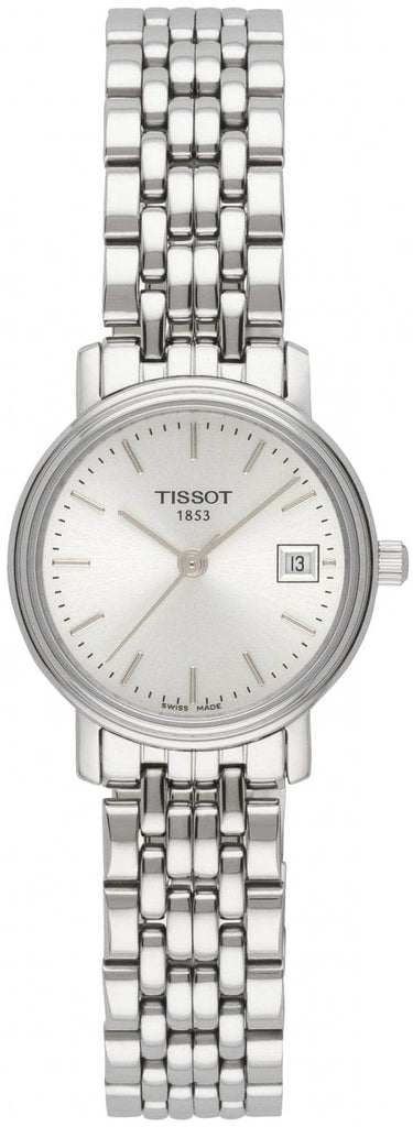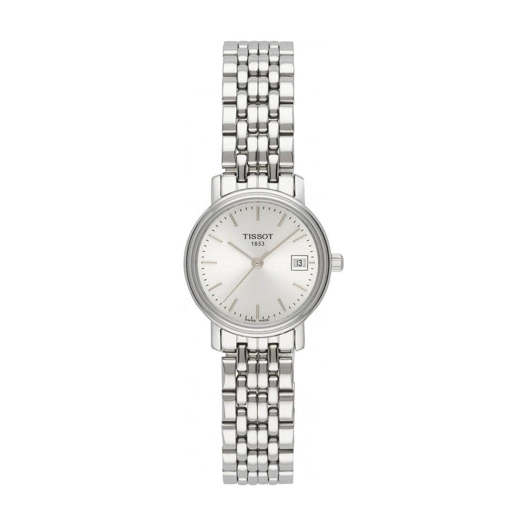 Stainless steel case with a stainless steel bracelet. Fixed stainless steel bezel. Silver dial with silver-tone hands and index hour markers. Minute markers around the outer rim. Dial Type: Analog. Date display at the 3 o'clock position. ETA 956.112 quartz movement. Scratch resistant sapphire crystal. Pull / push crown. Solid case back. Case size: 24 mm. Case thickness: 6 mm. Round case shape. Band width: 12 mm. Jewelry clasp. Water resistant at 30 meters / 100 feet. Functions: date, hour, minute, second. Casual watch style. Watch label: Swiss made. Item Variations: T52128131. Tissot Desire Steel Case Silver Dial Ladies Watch T52.1.281.31.