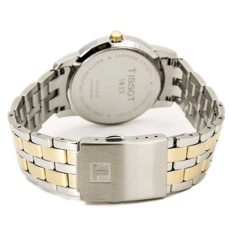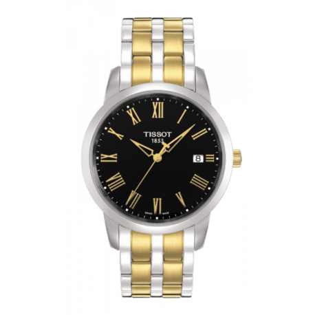 Brand New Authentic Tissot T-Classic Classic Dream Two Tone Men's Fashion Watch Model T033.410.22.053.01. Stainless Steel case with Two-Tone Stainless Steel watch band. Deployment with Push Button clasp. Fixed bezel. Dial description: Yellow gold tone hands and Roman Numeral hour markers on a Black dial. Quartz movement. Powered by ETA Caliber 805.112 engine. Watch functions: Date, Hour, Minute, Second. Pull/Push crown. Scratch Resistant Sapphire crystal. Round case shape. Case size: 38mm. Case thickness: 7.4mm. Solid case back. 30 Meters - 100 Feet water resistant. 2 year warranty. Also known as model: T0334102205301, T033-410-22-053-01.