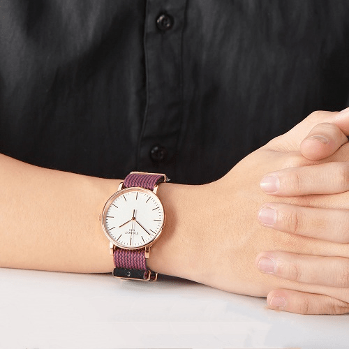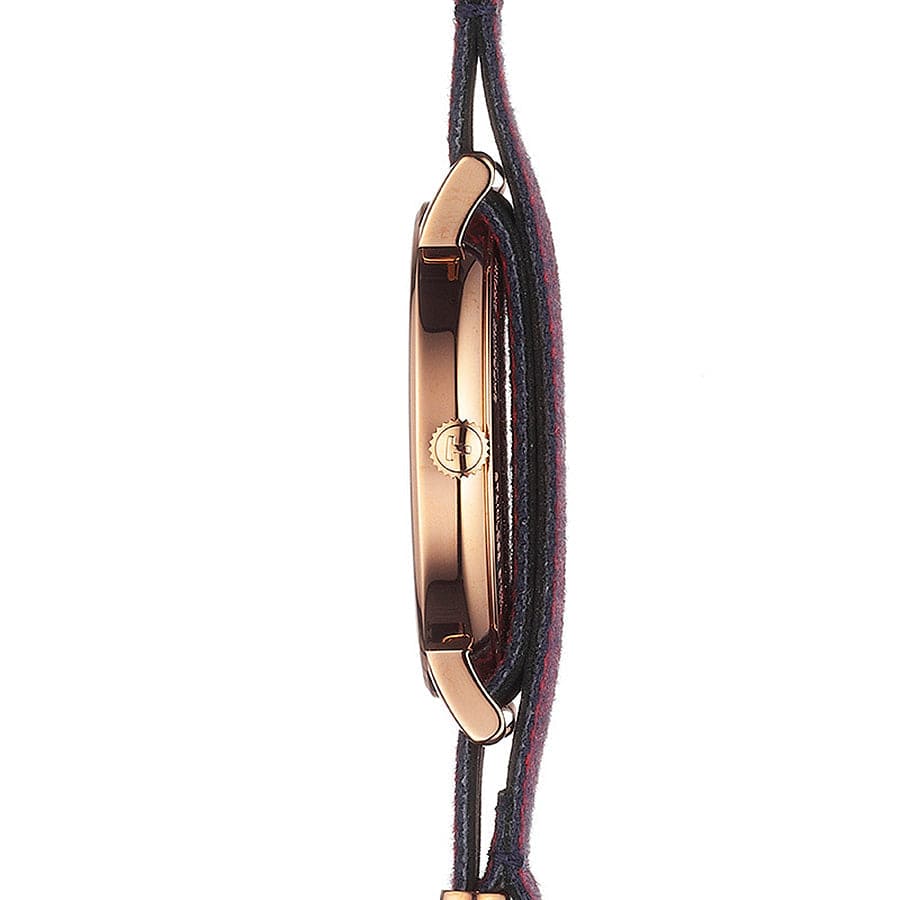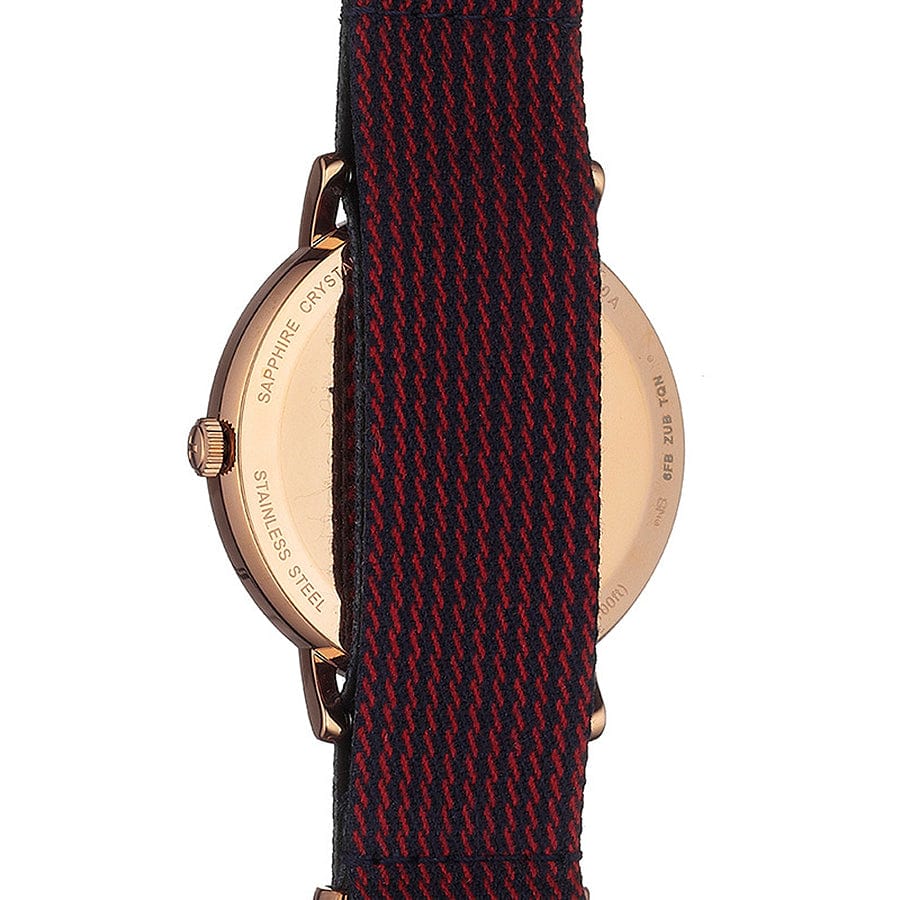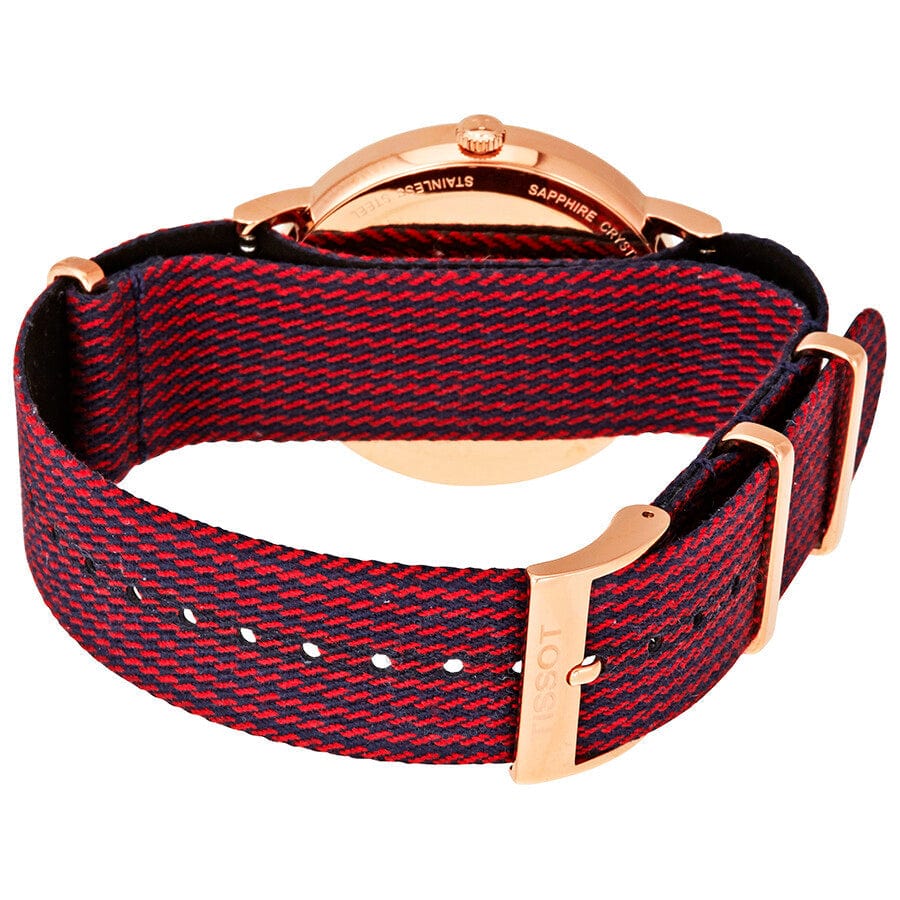 Rose gold PVD stainless steel case with a blue and red fabric strap. Fixed rose gold PVD bezel. Silver dial with rose gold-tone hands and index hour markers. Minute markers around the outer rim. Dial Type: Analog. Tissot calibre 902.101 quartz movement. Scratch resistant sapphire crystal. Pull / push crown. Solid case back. Case size: 38 mm. Case thickness: 6.45 mm. Round case shape. Tang clasp. Water resistant at 30 meters / 100 feet. Functions: hour, minute, second. Casual watch style. Watch label: Swiss Made. Tissot T-Classic Everytime Silver Dial Unisex Watch T109.410.38.031.00.