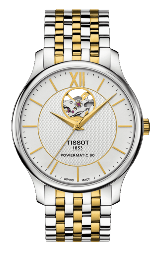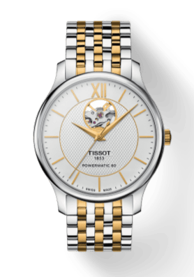 Tissot Tradition Powermatic 80 Open Heart Silver Dial Two Tone Steel Strap Watch For Men - T063.907.22.038.00