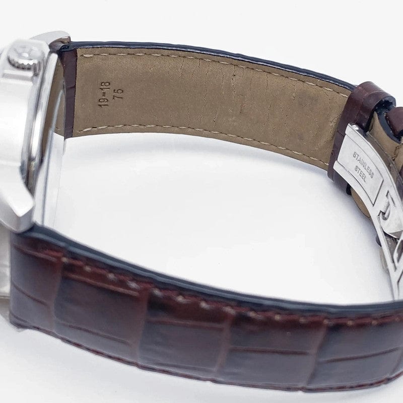 Stainless steel case with a brown leather strap. Fixed stainless steel bezel. White dial with silver-tone hands and stick hour markers. Minute markers around the outer rim. Dial Type: Analog. Luminescent hands and markers. Day of the week and date display appears at the 3 o'clock position. Automatic movement. Scratch resistant sapphire crystal. Skeleton case back. Case diameter: 39 mm. Case thickness: 9.5 mm. Round case shape. Tang clasp. Water resistant at 30 meters / 100 feet. Functions: date, day, hour, minute, second. Dress watch style. Watch label: Swiss Made.