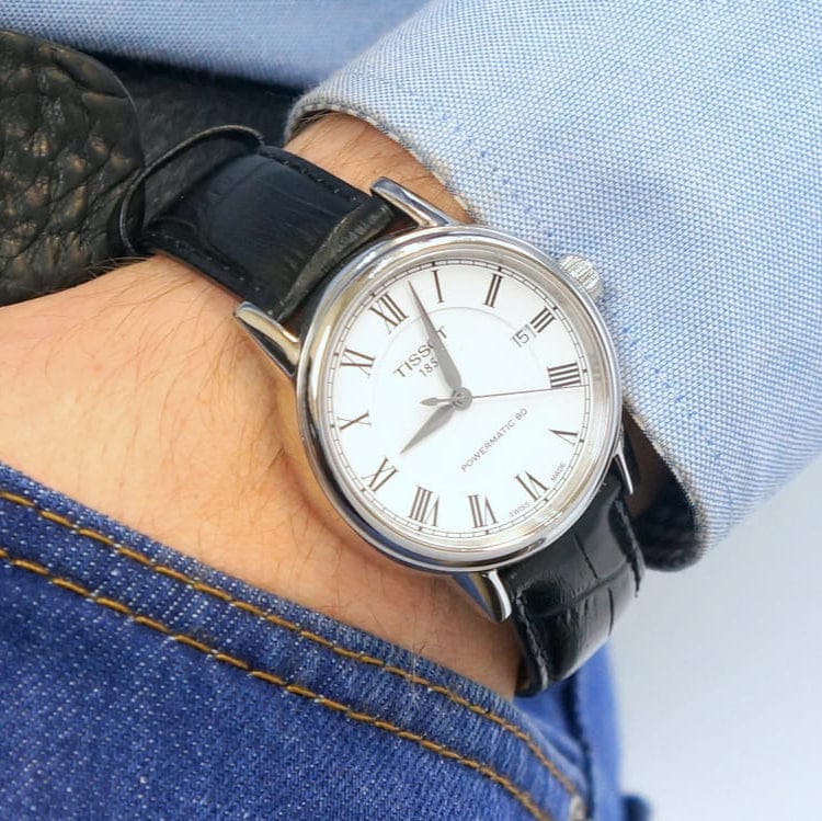 Maximize your style and efficiency with the Tissot Carson Powermatic 80 White Dial Black Leather Strap Watch. With a sleek design and precise Powermatic 80 movement, this watch is both fashionable and functional. The black leather strap provides comfort and durability, making it the perfect accessory for any modern man.