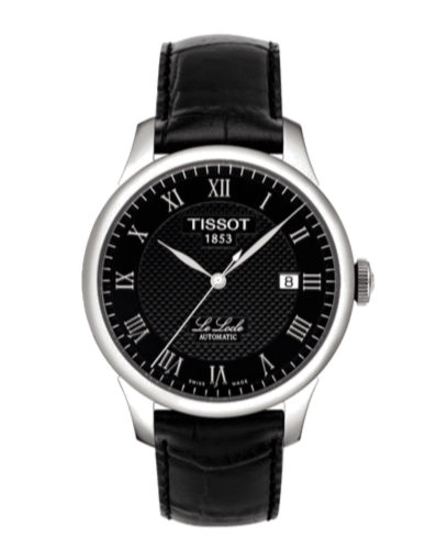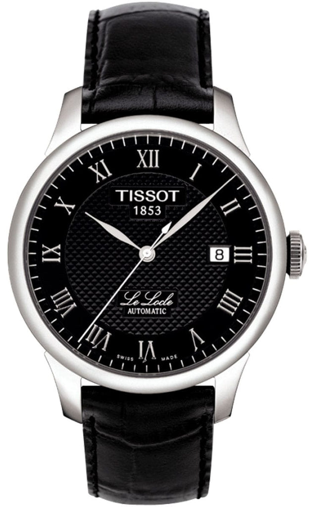 Stainless steel case with a black leather strap. Fixed stainless steel bezel. Black dial with silver-tone hands and Roman numeral hour markers. Minute markers around the outer rim. Dial Type: Analog. Date display at the 3 o'clock position. ETA 2824-2 automatic movement with a 38-hour power reserve. Scratch resistant sapphire crystal. Pull / push crown. Skeleton case back.Case size: 39 mm. Case thickness: 9.75 mm. Round case shape. Band width: 20 mm. Band length: 7 inches. Deployment clasp. Water resistant at 30 meters / 100 feet. Functions: hours, minutes, seconds, calendar. Casual watch style. Watch label: Swiss Made. Item Variations: T41 1 423 53, T41-1-423-53, T41/1/423/53, T41142353. Tissot T-Classic Le Locle Automatic Men's Watch T41.1.423.53.
