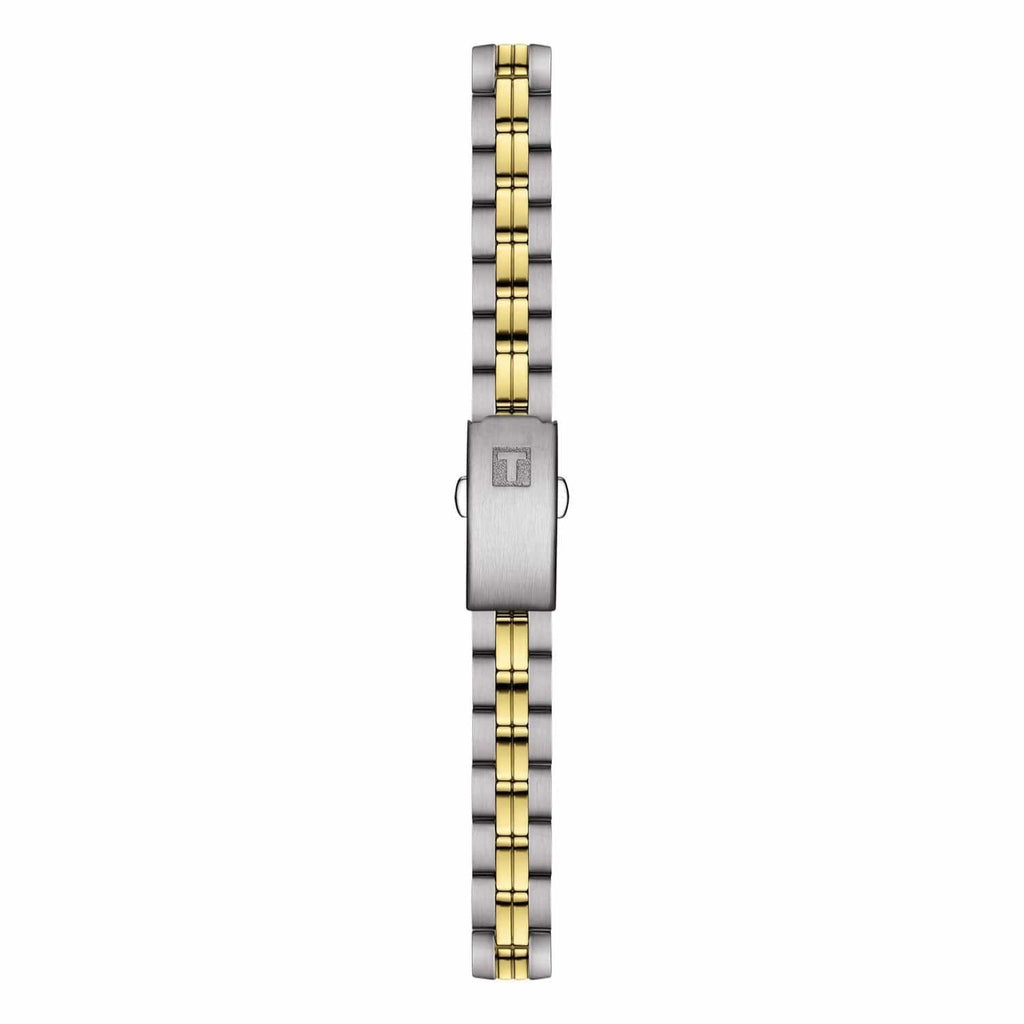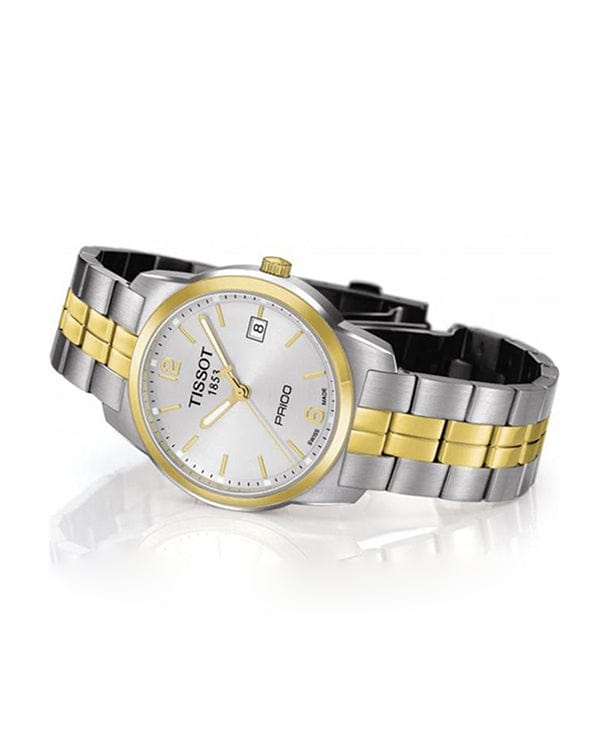 Stainless steel case with a two-tone (silver and gold PVD) stainless steel bracelet. Fixed gold PVD bezel. Silver dial with luminous gold-tone hands and Arabic numeral hour markers. Minute markers around the outer rim. Dial Type: Analog. Luminescent hands and markers. Date display at the 3 o'clock position. Quartz movement. Scratch resistant sapphire crystal. Solid case back. Case diameter: 23.6 mm. Case thickness: 6.6 mm. Round case shape. Fold over clasp. Water resistant at 100 meters / 330 feet. Functions: date, hour, minute, second. Casual watch style. Watch label: Swiss Made. Tissot PR100 Silver Dial Two-tone Ladies Watch T0492102203200