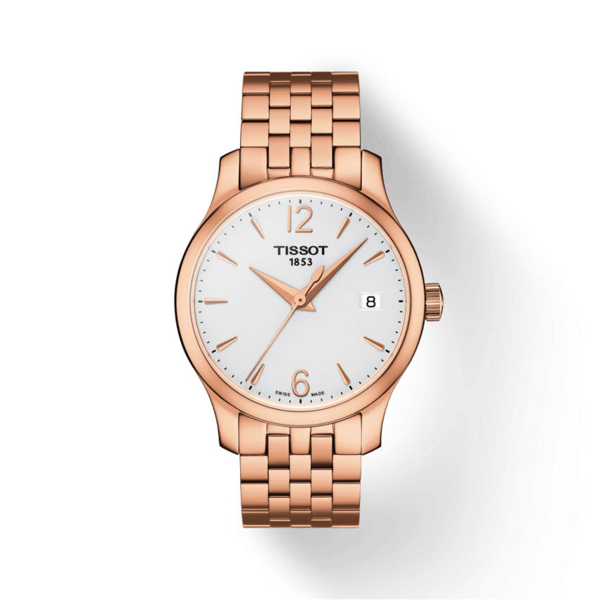 Rose gold PVD stainless steel case and bracelet. Fixed rose gold PVD bezel. White dial with rose gold-tone hands and index hour markers. Arabic numerals mark the 6 and 12 o'clock positions. Minute markers around the outer rim. Date display at the 3 o'clock position. Tissot calibre ETA F05.111 quartz movement. Scratch resistant sapphire crystal. Pull / push crown. Solid case back. Case size: 33 mm. Case thickness: 7.3 mm. Round case shape. Band width: 16 mm. Butterfly clasp. Water resistant at 30 meters / 100 feet. Functions: date, hour, minute, second. Casual watch style. Watch label: Swiss Made. Tissot Tradition T-Classic White Dial Ladies Watch T063.210.33.037.00.
