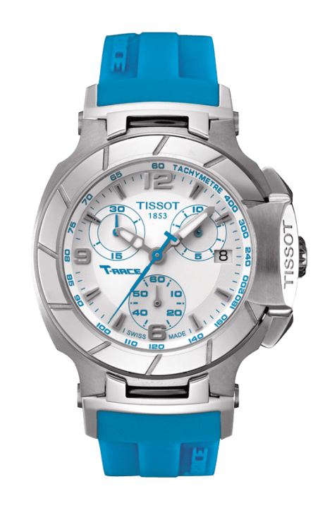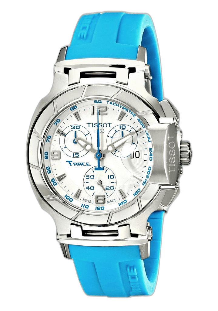 Stainless steel case with a sky blue silicone strap. Stainless steel bezel. White dial with silver-tone hands and index hour markers. Arabic numerals mark the 6, 9 and 12 o'clock position. Minute markers. Tachymeter around the outer rim. Dial Type: Analog. Luminescent hands and markers. Date display at the 3 o'clock position. Chronograph - three sub-dials displaying: 60 seconds, 30 minutes and 1/10th of a second. Quartz movement. Scratch resistant sapphire crystal. Push / pull crown. Solid case back. Case diameter: 36 mm. Case thickness: 12 mm. Band width: 16 mm. Band length: 7 inches. Deployment clasp. Water resistant at 100 meters / 330 feet. Functions: hours, minutes, seconds, 1/10 seconds, chronograph and date. Sport watch style. Watch label: Swiss Made. Tissot T Race Chronograph Sky Blue Silicone Strap Ladies Watch T0482171701702.