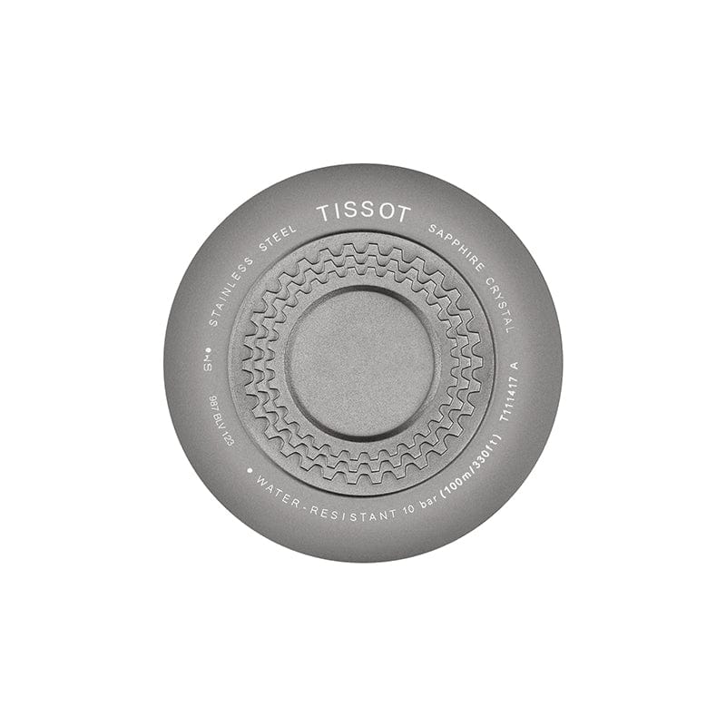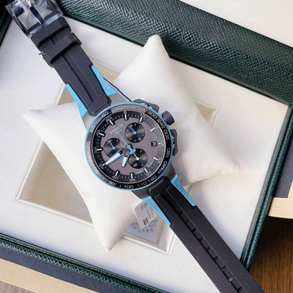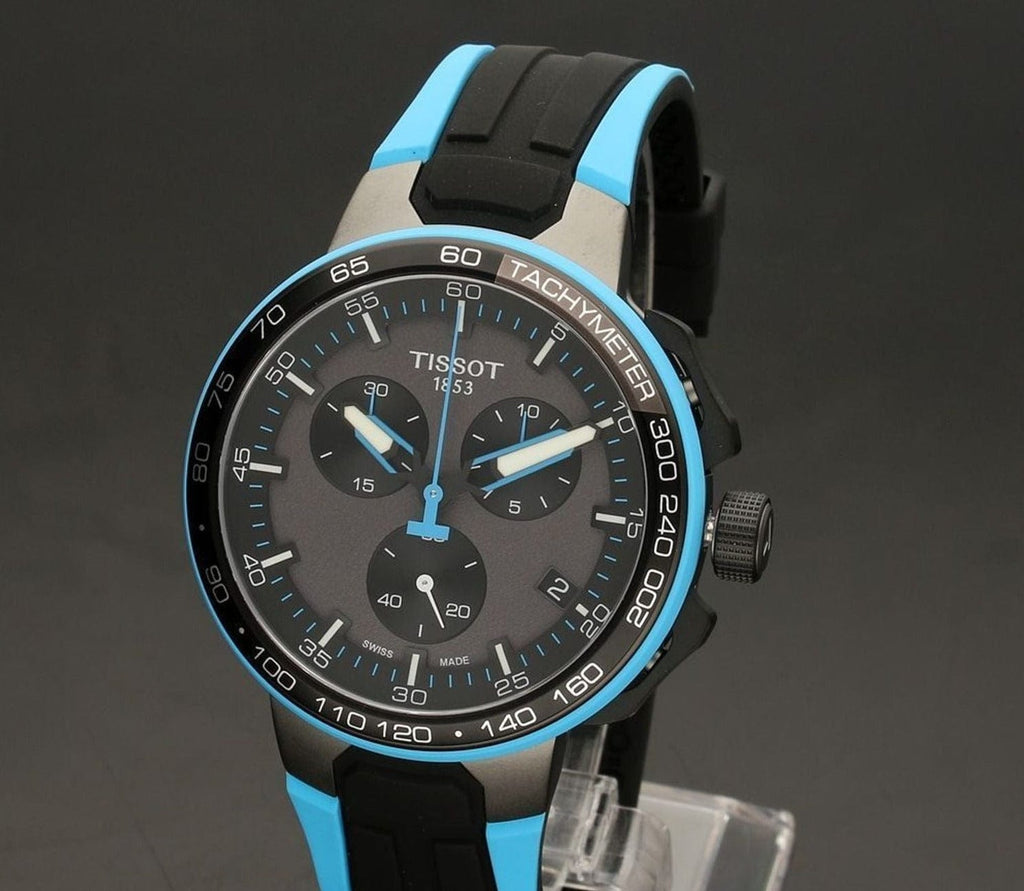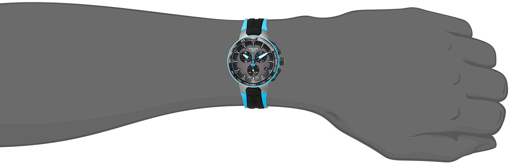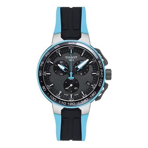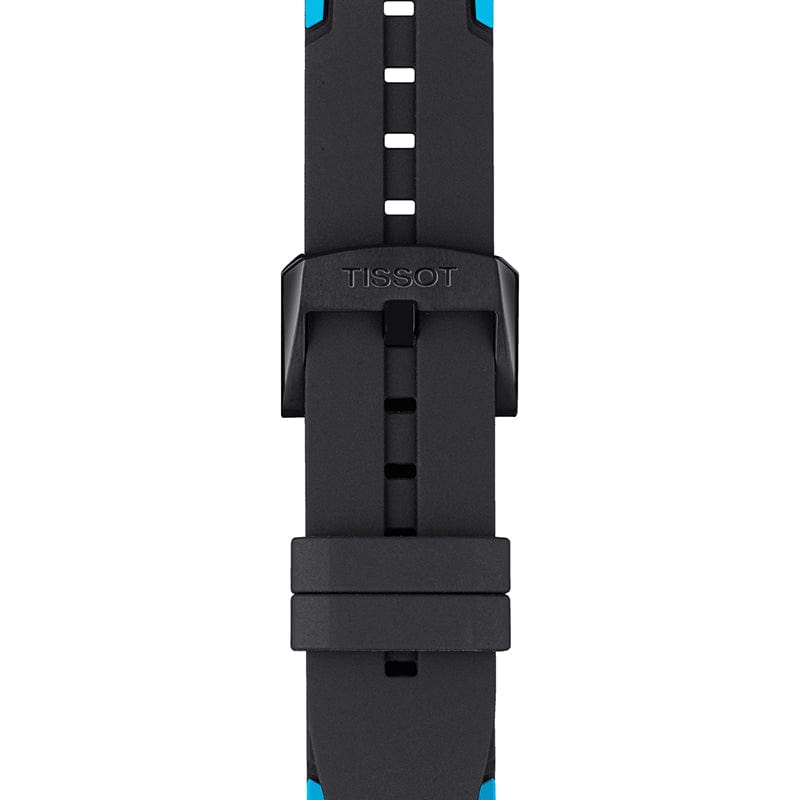 Black dial enhanced by luminous blue hands. Grey PVD stainless steel case with a two-tone (black and blue) silicone band. Quartz movement. 100 meters / 330 feet water resistance. Fixed bezel. Scratch Resistant Sapphire crystal. Solid caseback. Tang clasp. Pull / Push crown. Case size 44.5 mm x 11.4 mm. Band 18 mm x long. Tissot T111.417.37.441.05 T-Race Cycling Watch.
