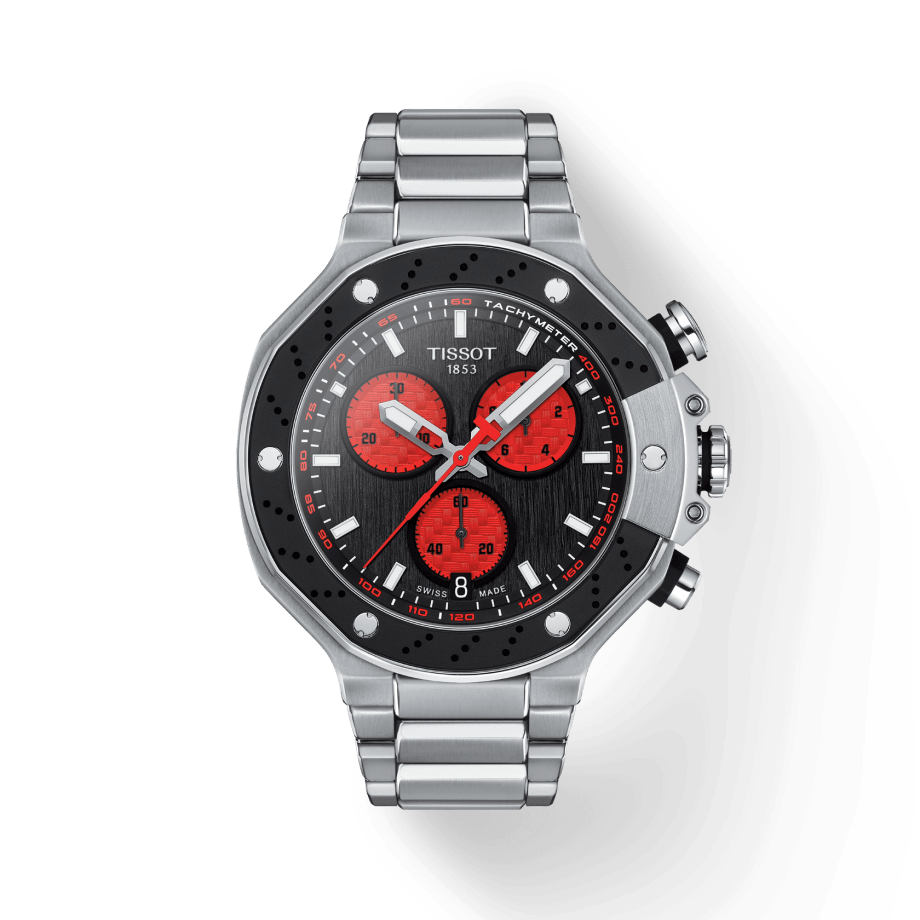 Tissot Limited Edition T-Race Marc Marquez 2022 Watch T141.417.11.051.00 combines a 45mm round-shaped stainless-steel case and silver stainless steel bracelet with a push-button deployment clasp. This watch has a black analogue dial with silver luminescent hands and a red second tracker. The date is visible at position six and features three red chronograph sub-dials and a tachymeter scale on the bezel, protected beneath sapphire crystal glass. Power is generated by the Swiss quartz movement with an end-of-life indicator with a water resistance of up to 100 metres.