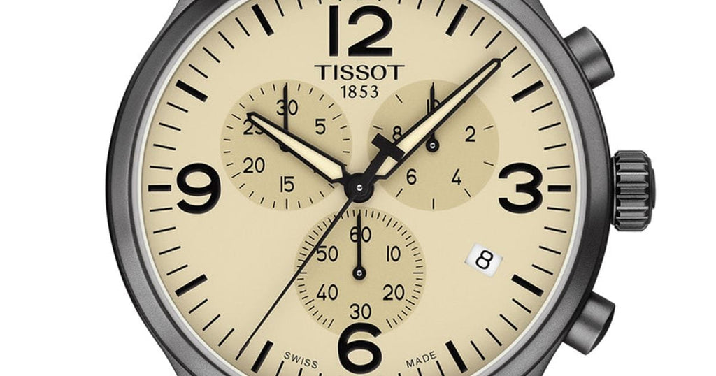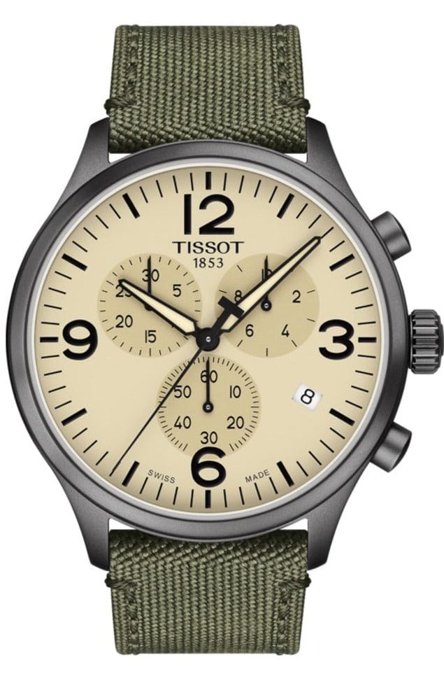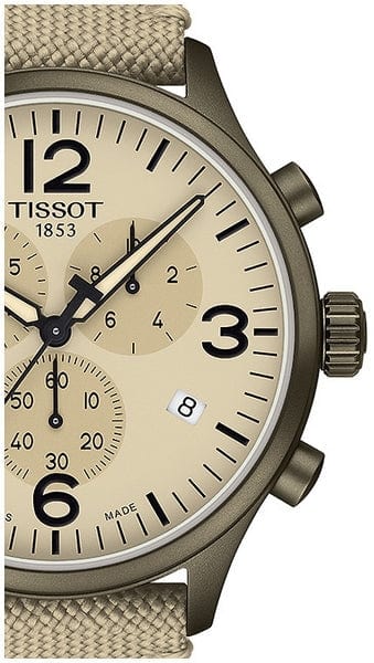Grey PVD stainless steel case with a khaki fabric strap. Fixed grey PVD bezel. Beige dial with luminous black alpha-style hands and index hour markers. Arabic numerals mark the 3, 6, 9 and 12 o'clock positions. Minute markers around the outer rim. Dial Type: Analog. Luminescent hands. Date display at the 4 o'clock position. Chronograph - three sub-dials displaying: 60 second, 30 minute and 12 hours. ETA caliber G10.212 quartz movement. Scratch resistant sapphire crystal. Pull / push crown. Solid case back. Round case shape. Case size: 45 mm. Case thickness: 11 mm. Band width: 22 mm. Tang clasp. Water resistant at 100 meters / 330 feet. Functions: chronograph, rattrapante, date, hour, minute, small second. Sport watch style. Watch label: Swiss Made. Tissot Chrono XL Quartz Beige Diasl Men's Watch T116.617.37.267.00.