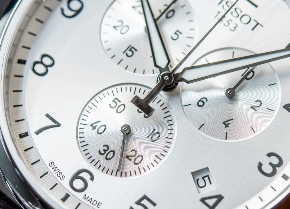 Larger than life, the Tissot Chrono XL is characterized by its big case that has a diameter of 45mm. The size of the dial makes time easily readable, with contemporary Arabic numerals at 12, 3, 6 and 9 o' clock. The chronograph function adds to its urban style.Available in multiple styles.