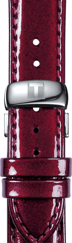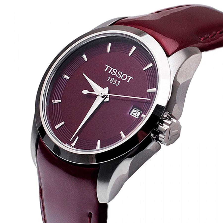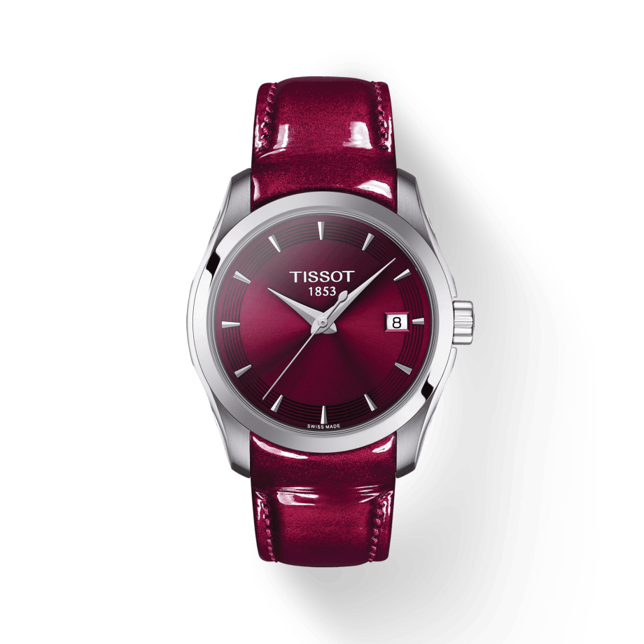 Silver-tone stainless steel case with a burgundy leather strap. Fixed silver-tone stainless steel bezel. Bordeau dial with silver-tone hands and index hour markers. Dial Type: Analog. Date display at the 3 o'clock position. ETA Caliber F05.111 quartz movement. Scratch resistant sapphire crystal. Pull / push crown. Solid case back. Round case shape, case size: 32 mm, case thickness: 8.1 mm. Band width: 18 mm. Butterfly clasp. Water resistant at 100 meters / 330 feet. Functions: date, hour, minute, second. T-sport couturier series. Casual watch style. Watch label: Swiss Made. Tissot T-Sport Couturier Quartz Ladies Watch T035.210.16.371.01.