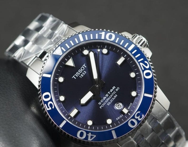 The Tissot Seastar 1000 merges style and performance without compromising either. The diving inspiration shapes both the appearance and the functionality of this watch. It maintains its performance to a pressure of 30 bar (300m/1'000ft), combining underwater sports and a preference for a sophisticated Swiss timepiece. The diving theme continues through elements such as a unidirectional bezel, a strap with a divers' buckle and extension, plus luminescent hands and markings.The automatic choice for real divers. With its high water-resistance up to a pressure of 30 bar (300 m/1000 ft), screw-down crown and caseback as well as its unidirectional ceramic bezel, the Tissot Seastar 1000 Silicium is the ultimate diving watch, now combined with the energy of the Powermatic 80 movement upgraded with a Silicon Balance Spring, making this watch even more appropriate for water sports activities.
