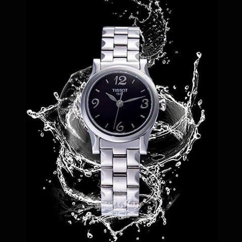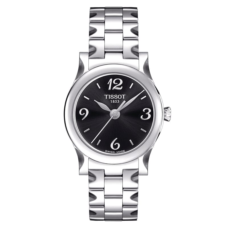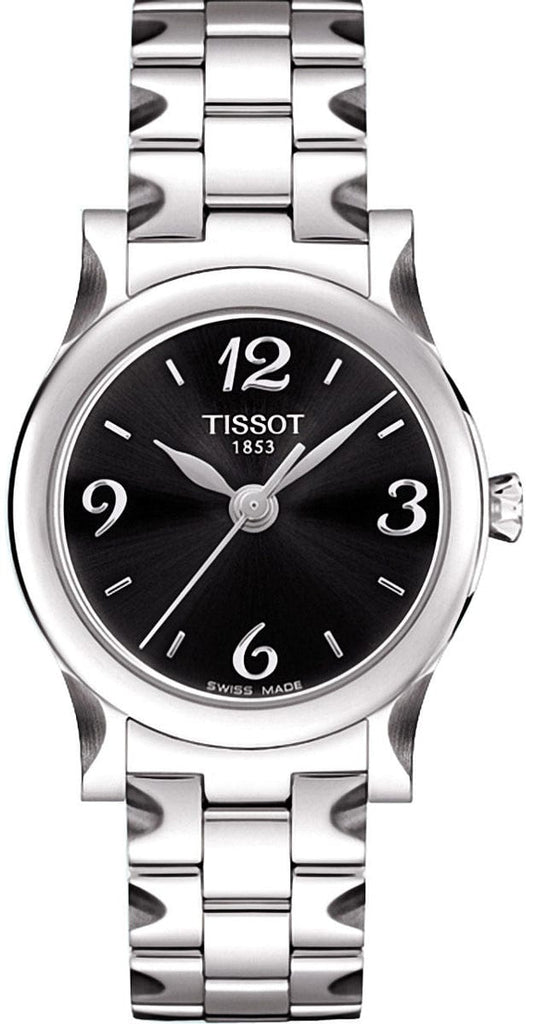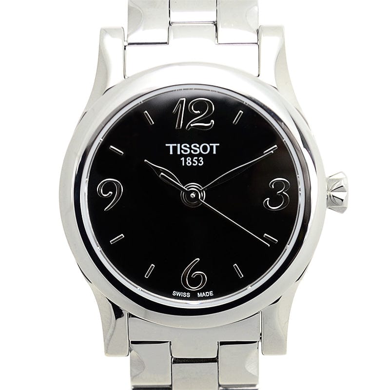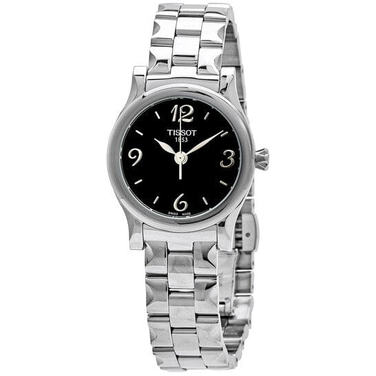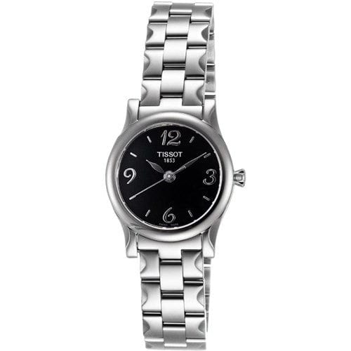 Stainless steel case with a stainless steel bracelet. Fixed stainless steel bezel. Black dial with silver-tone hands and index hour markers. Arabic numerals mark the 3, 6, 9 and 12 o'clock positions. Dial Type: Analog. ETA caliber F03.111 quartz movement. Scratch resistant sapphire crystal. Solid case back. Round case shape. Case size: 28 mm. Case thickness: 7.29 mm. Band width: 14mm. Butterfly clasp. Water resistant at 30 meters / 100 feet. Functions: hour, minute, second, battery eol indicator. Casual watch style. Watch label: Swiss Made. Item Variations: T028 210 11 057 00, T028-210-11-057-00, T028/210/11/057/00, T0282101105700. Tissot T-Classic Stylist-T Ladies Watch T028.210.11.057.00.
